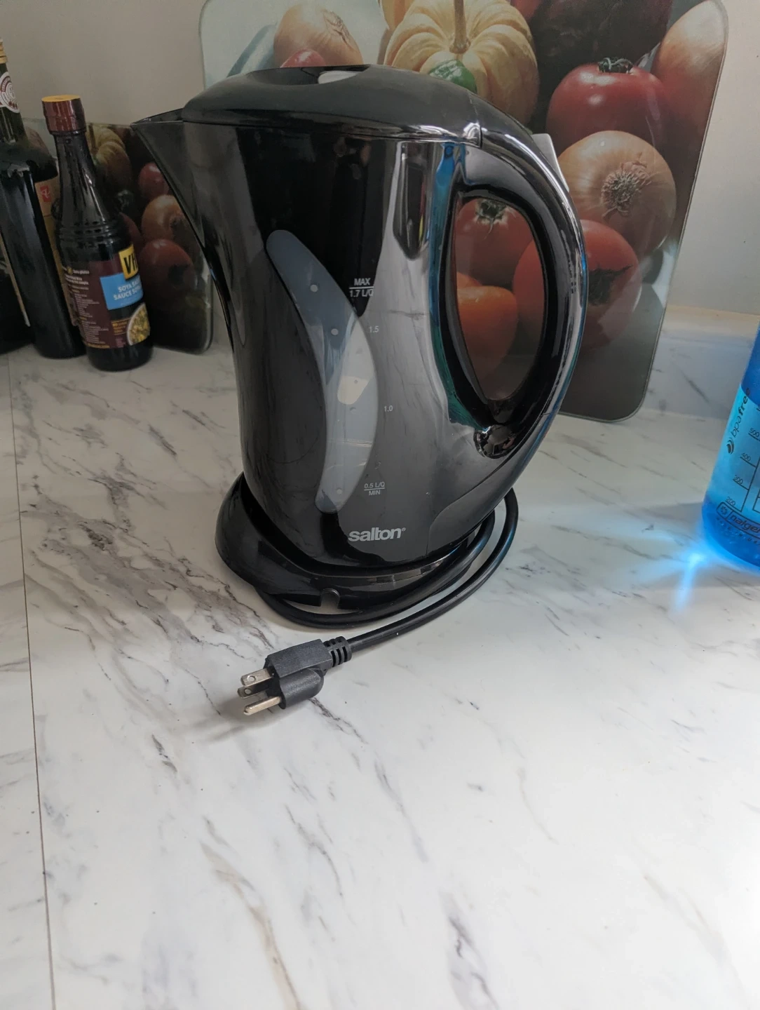 This is a black electric kettle by Salton. It has a maximum capacity of 1.7 litres. It's great for quickly boiling water for tea or coffee.