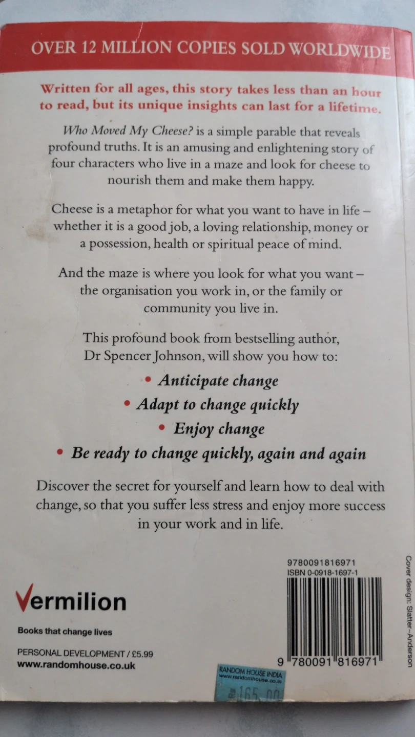 78Selling the book 'Who Moved My Cheese?' by Dr. Spencer Johnson. It's a simple parable that reveals profound truths. An amusing and enlightening story of four characters who live in a maze and look for cheese to nourish them and make them happy. Discover the secret for yourself and learn how to deal with change, so that you suffer less stress and in your work and in life