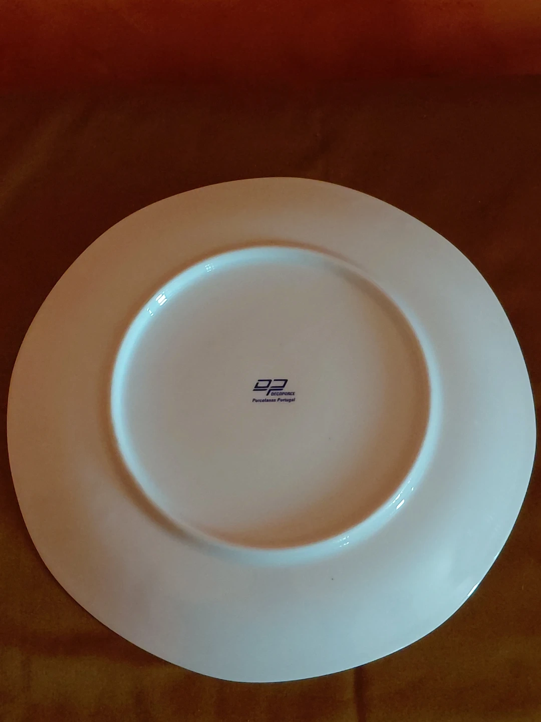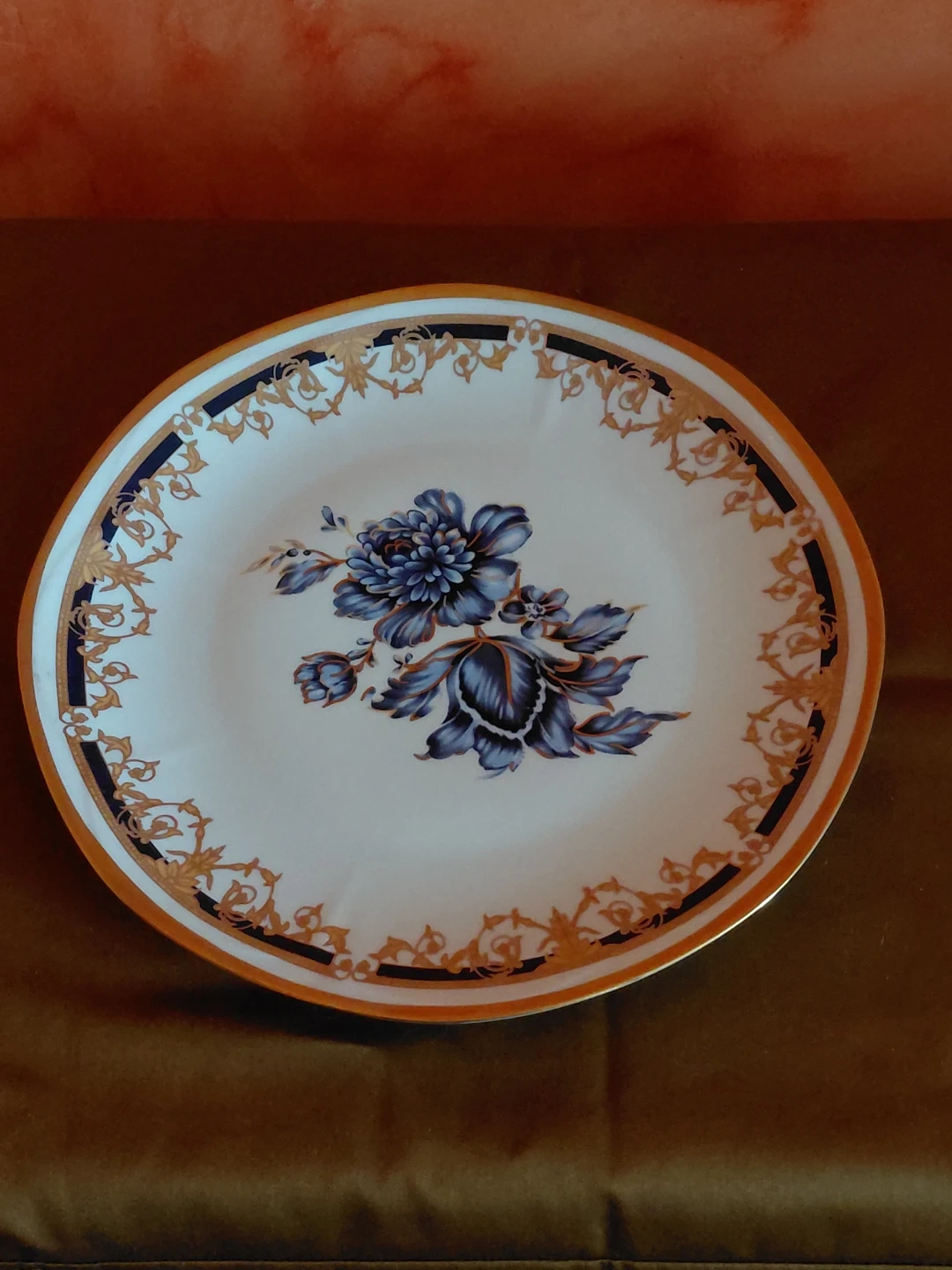 Decorative plate from DP Porcelana Portugal. It features a blue floral design with gold and navy trim. Made of porcelain.