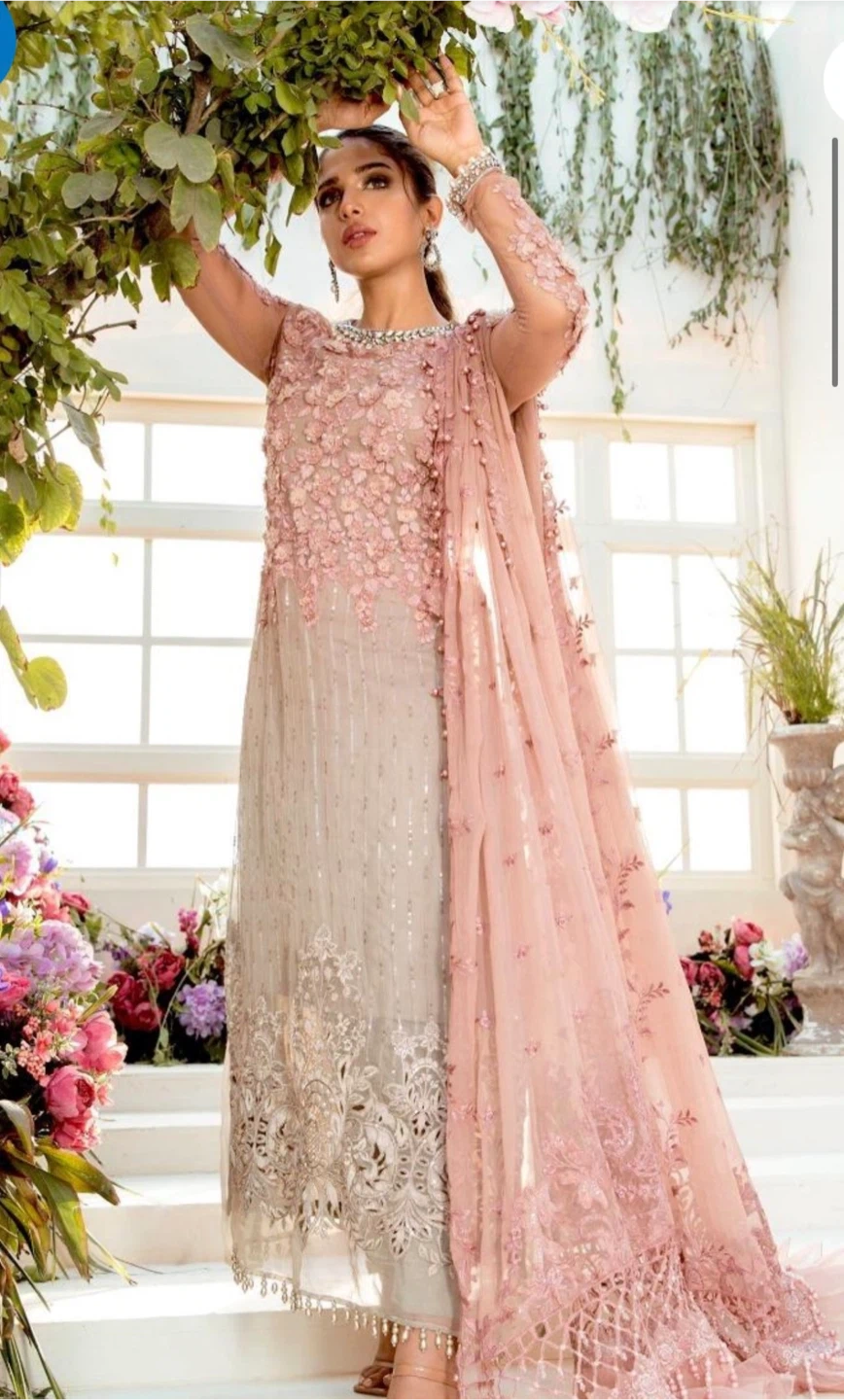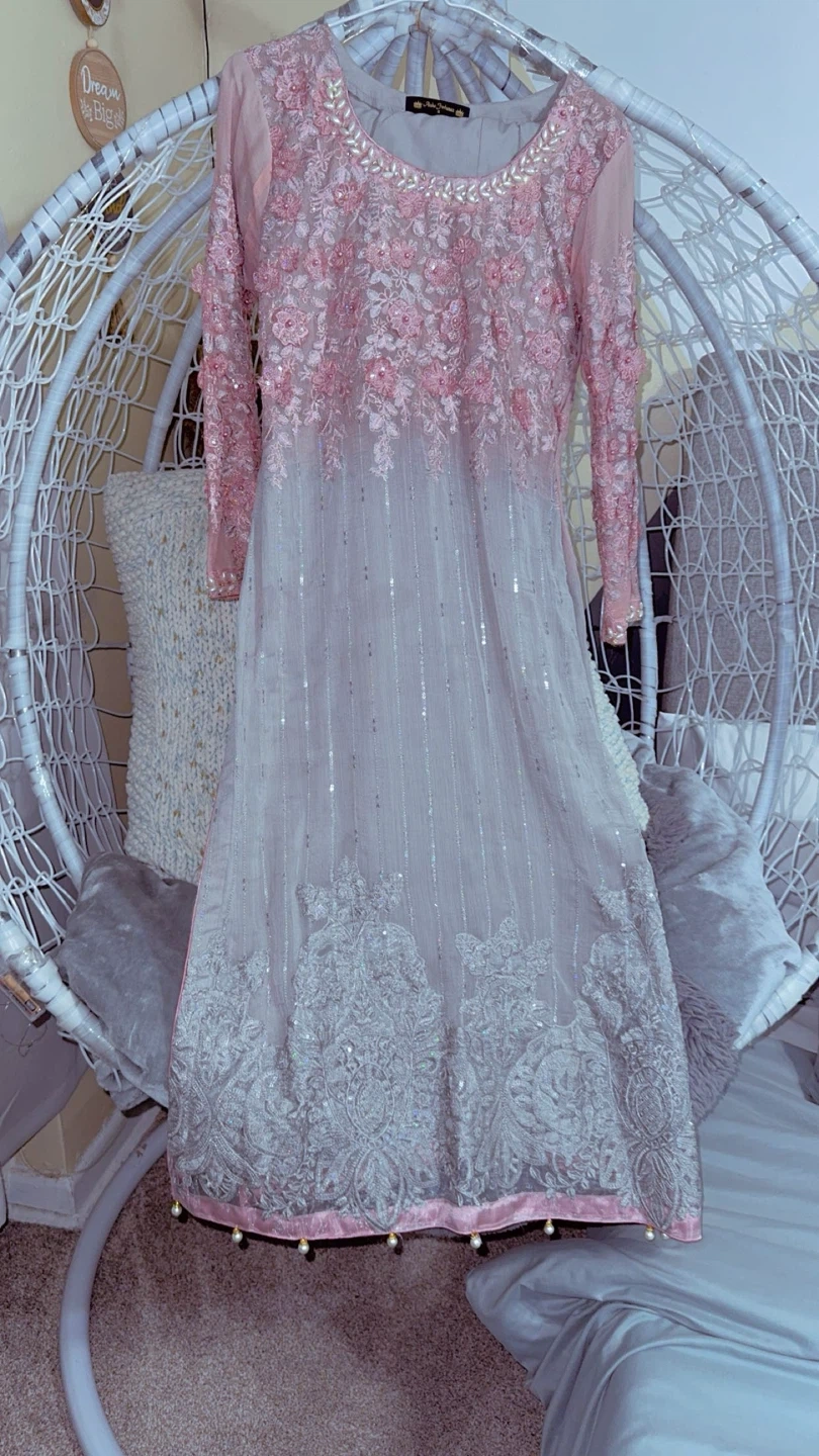 Beautiful pink and grey embroidered Pakistani dress. It features intricate floral and lace detailing with sequin embellishments. Comes with a matching sheer dupatta. This outfit's perfect for festive occasions.