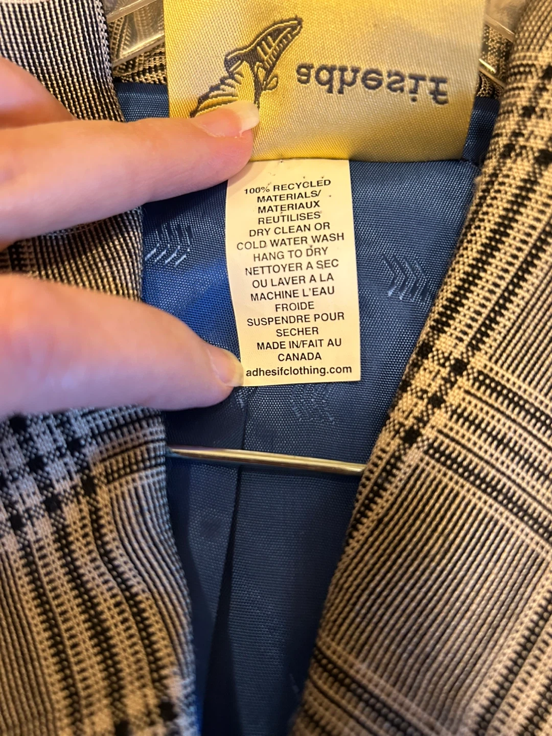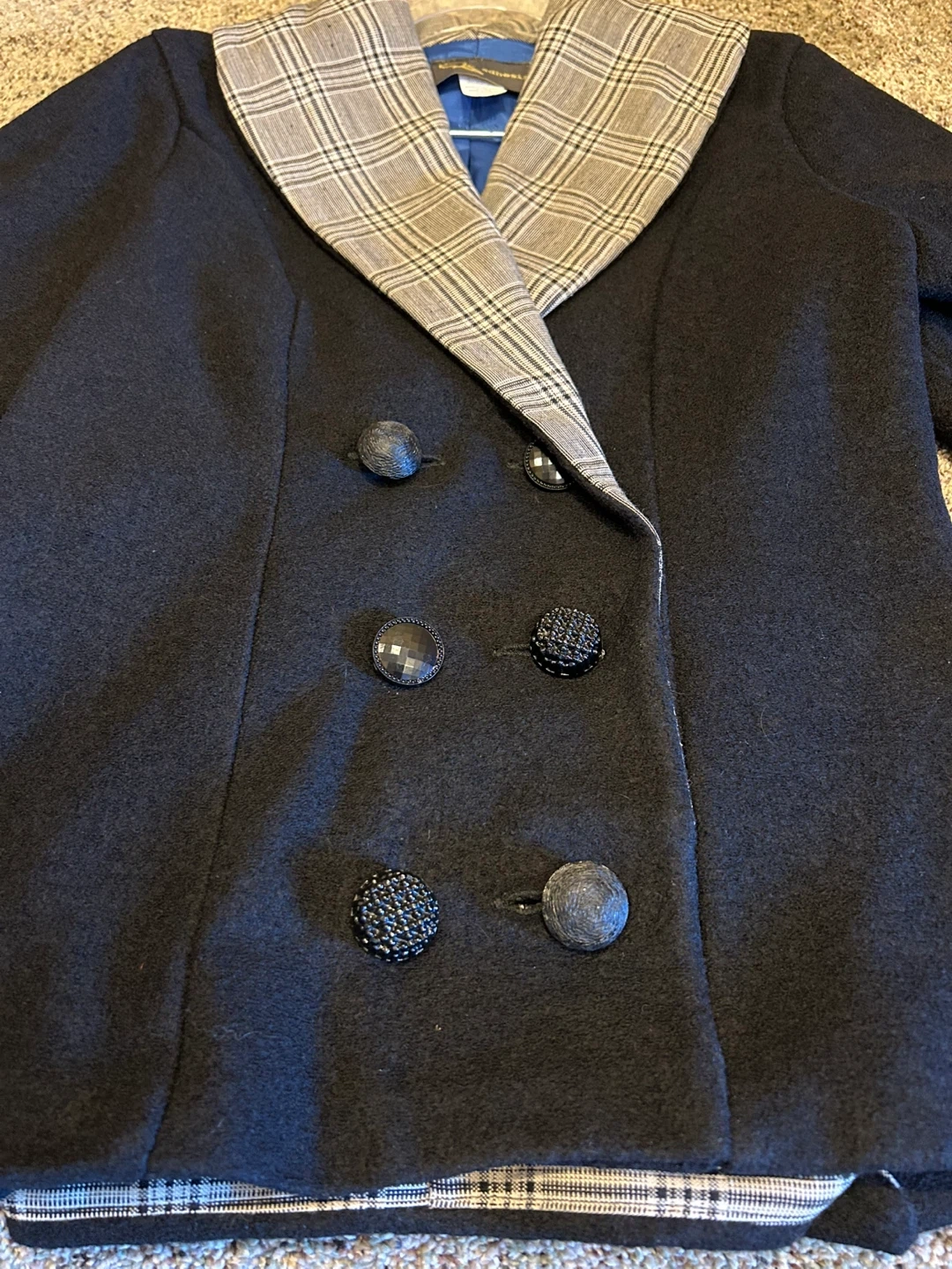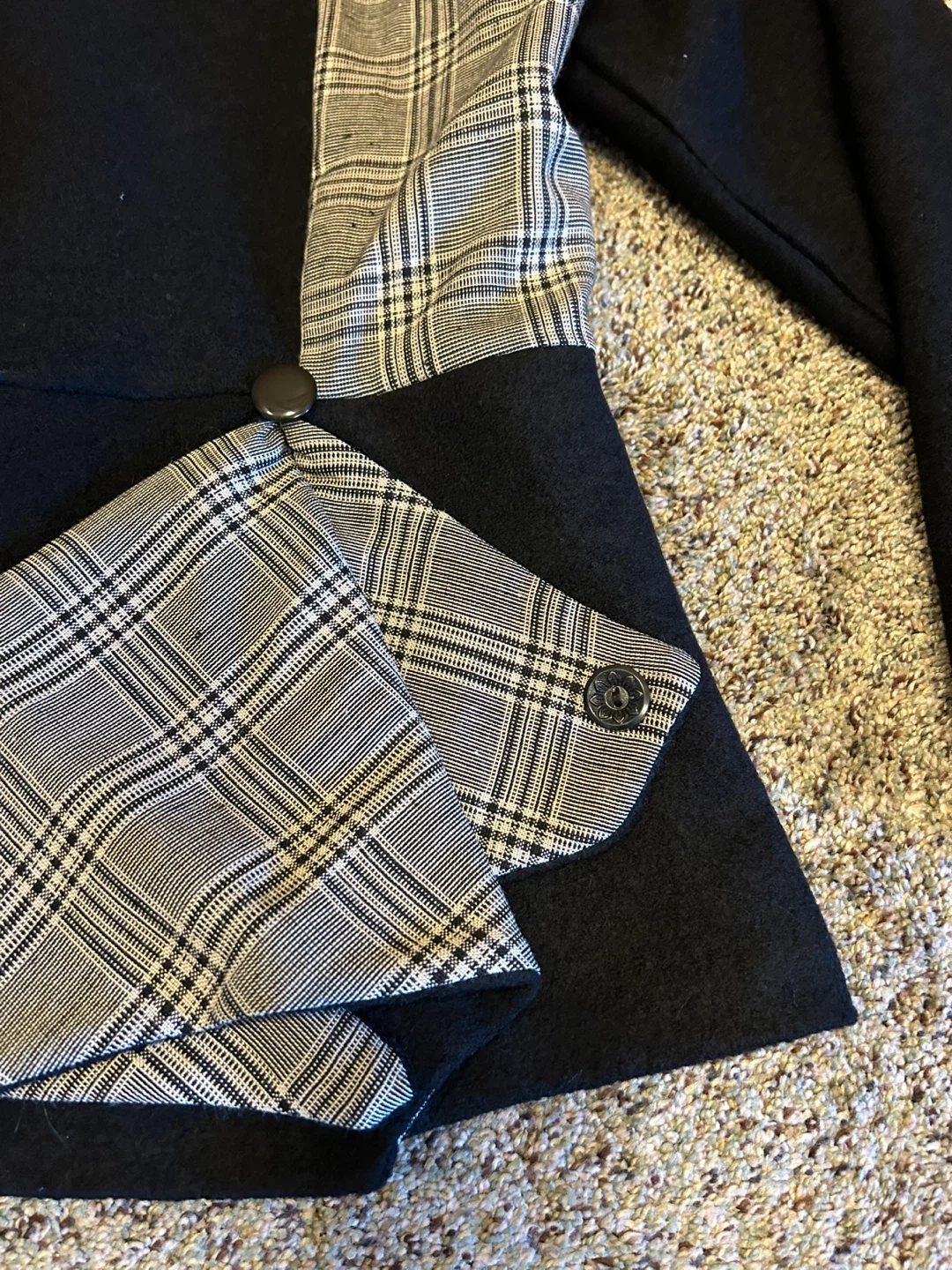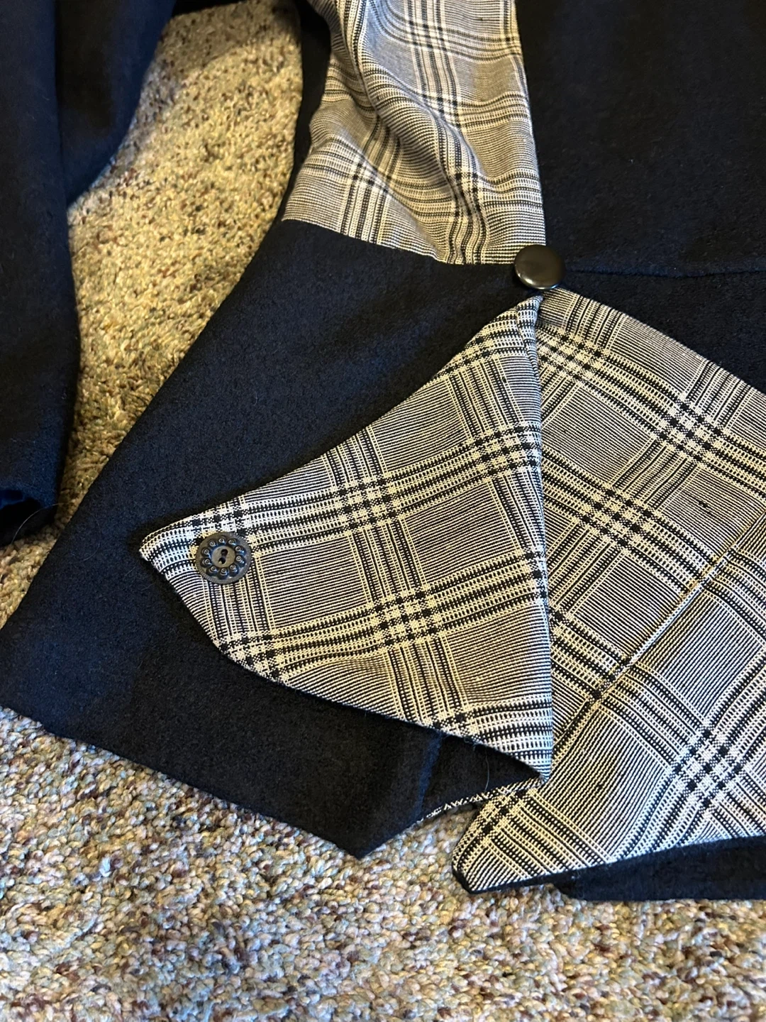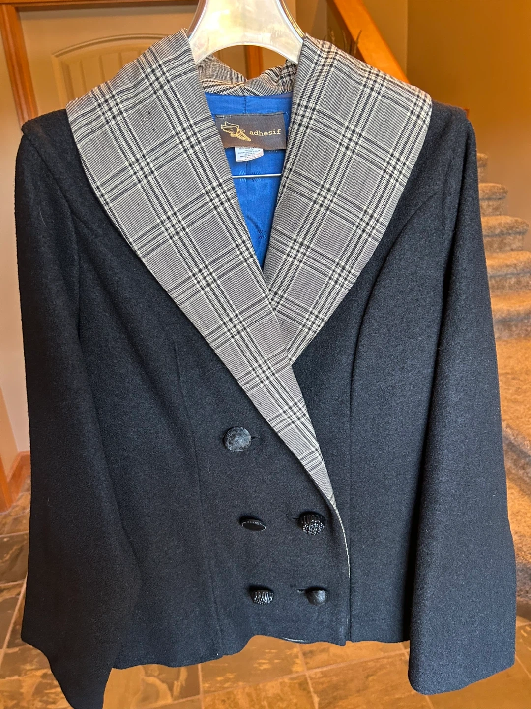 Stylish Adhesif blazer in black with plaid accents. It's made from a wool blend fabric. Features unique pocket and collar detailing with button closures.