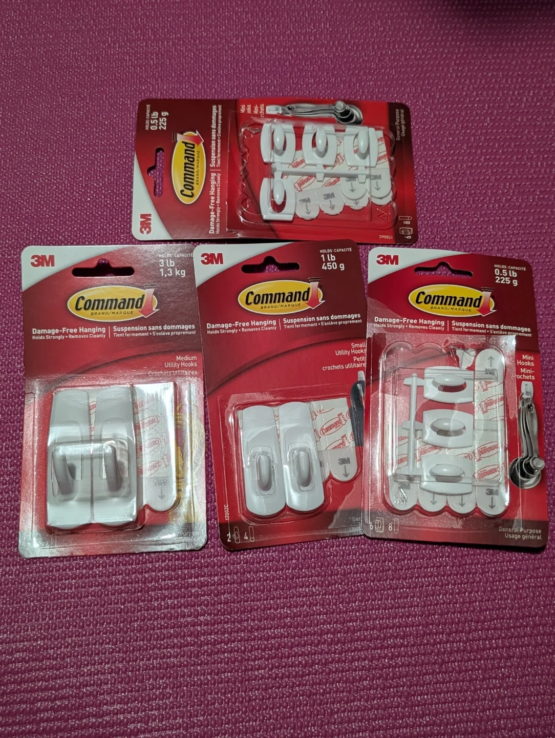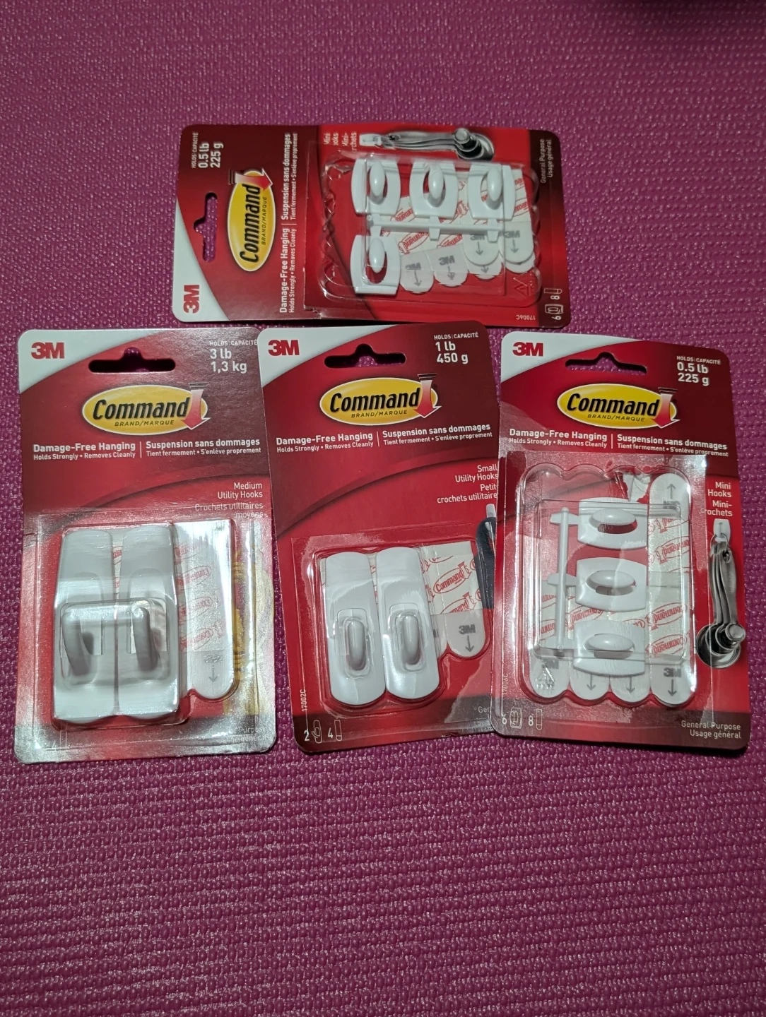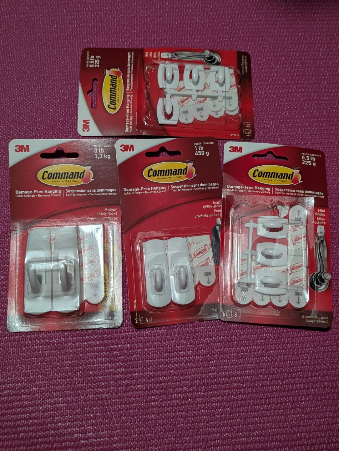 This is a bundle of assorted 3M Command Hooks, including packs for 0.5 lb, 1 lb, and 3 lb weight capacities. They're damage-free hanging and remove cleanly. These hooks are great for organizing small items and hanging lightweight decor.