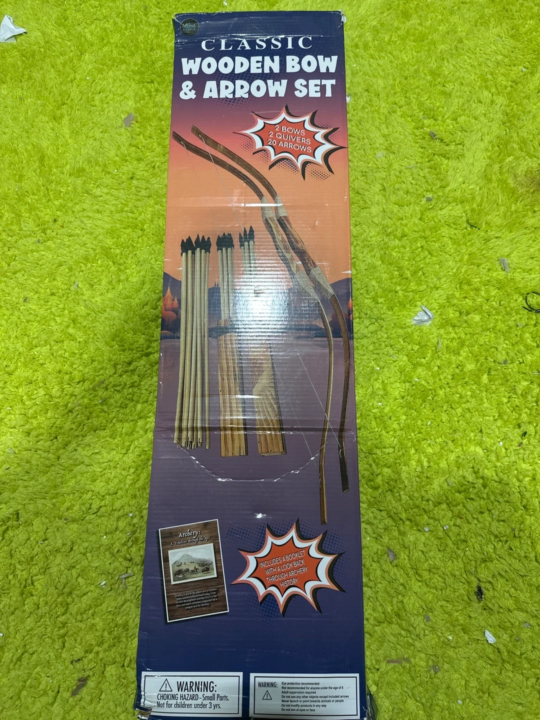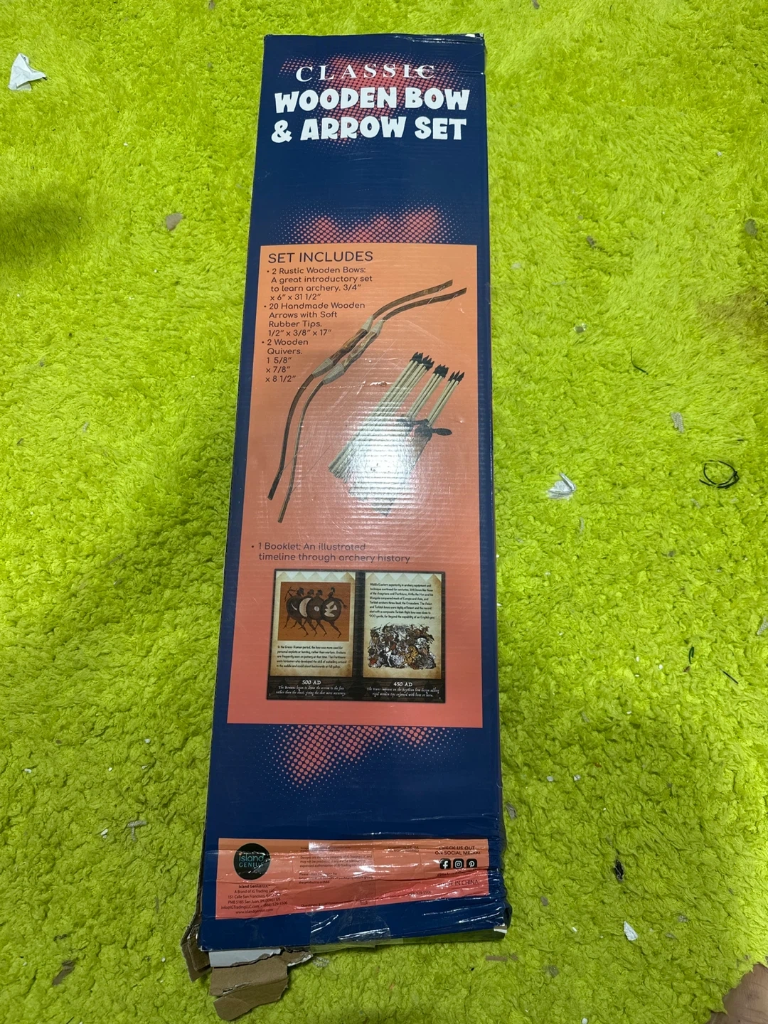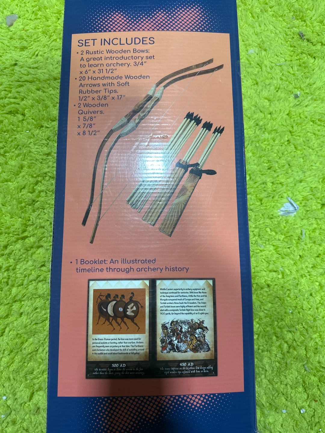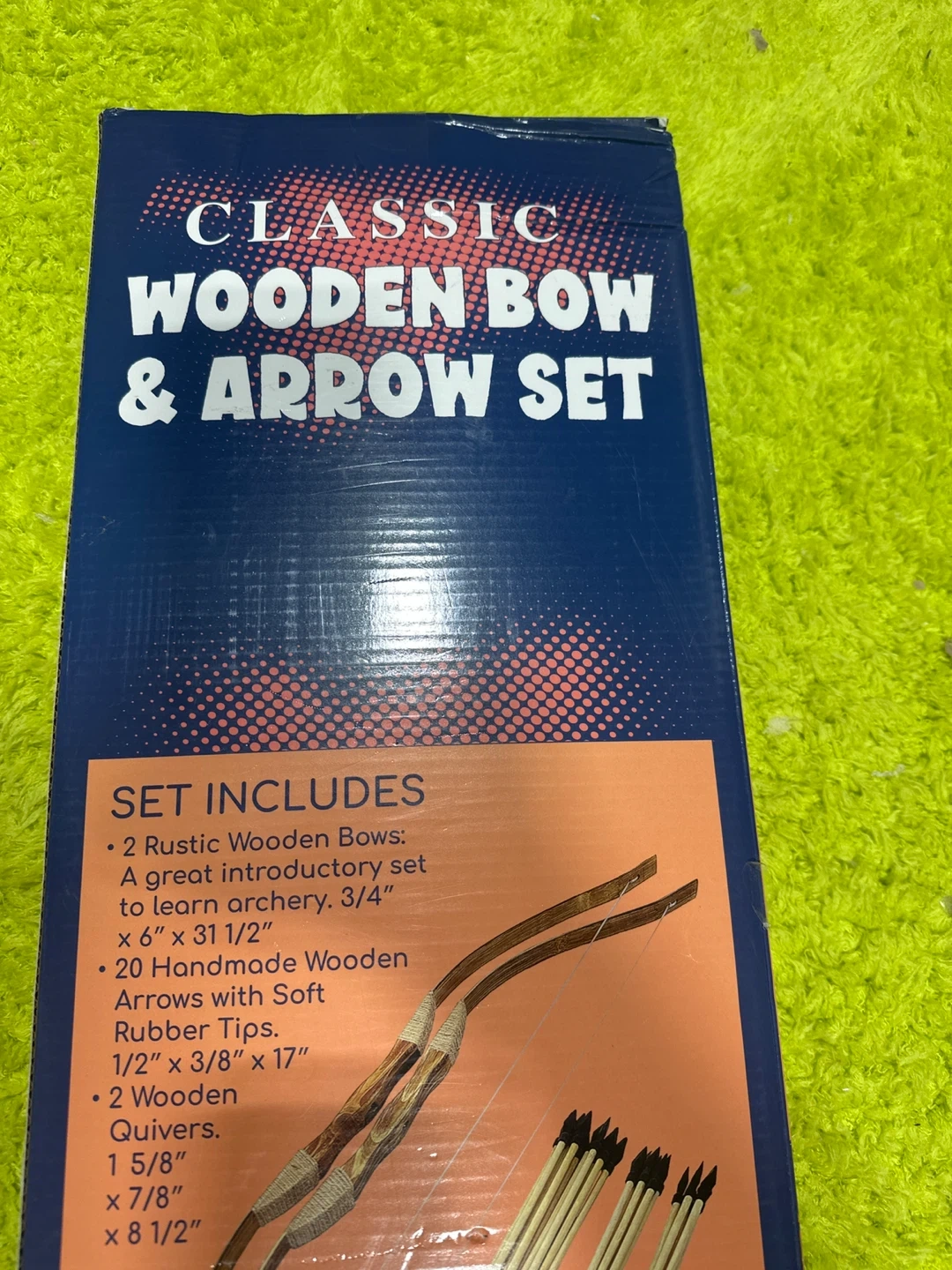 This set includes 2 rustic wooden bows and 20 handmade wooden arrows with soft rubber tips. You also get 2 wooden quivers and a booklet with a timeline of archery history. It's a great introductory set to learn archery!