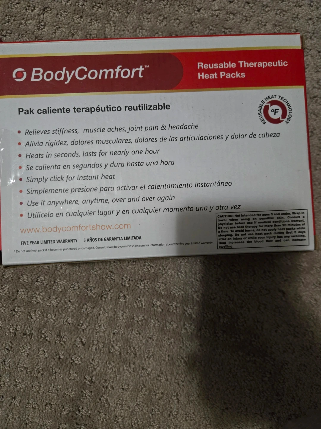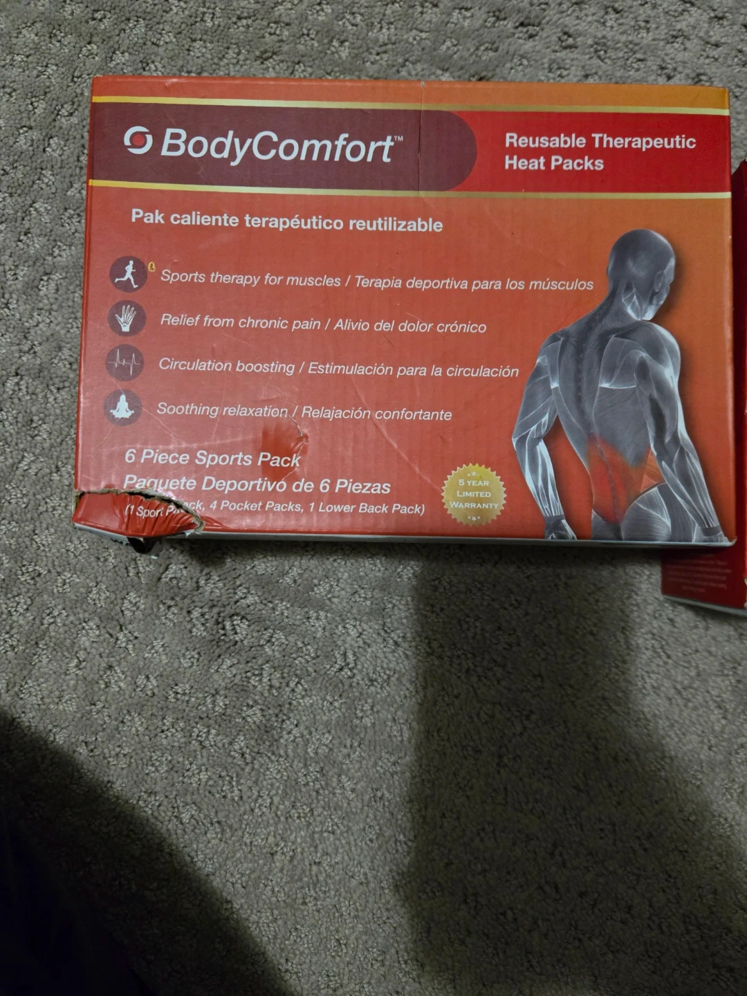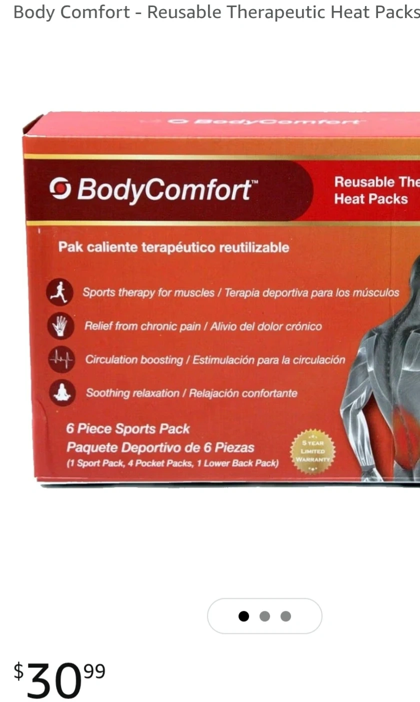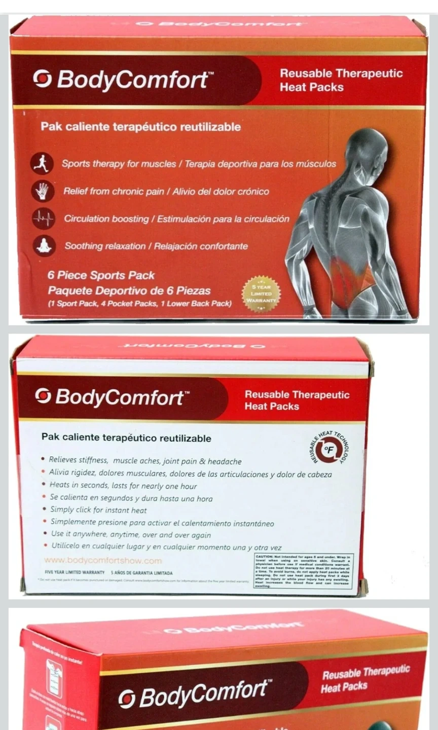 This is a 6-piece sports pack of Body Comfort reusable therapeutic heat packs. It includes 1 sport pack, 4 pocket packs, and 1 lower back pack. These heat packs provide relief for stiffness, muscle aches, joint pain, and headaches. They heat up in seconds and last for nearly one hour, offering soothing relaxation. Use them anytime, anywhere, over and over again! $15each box
