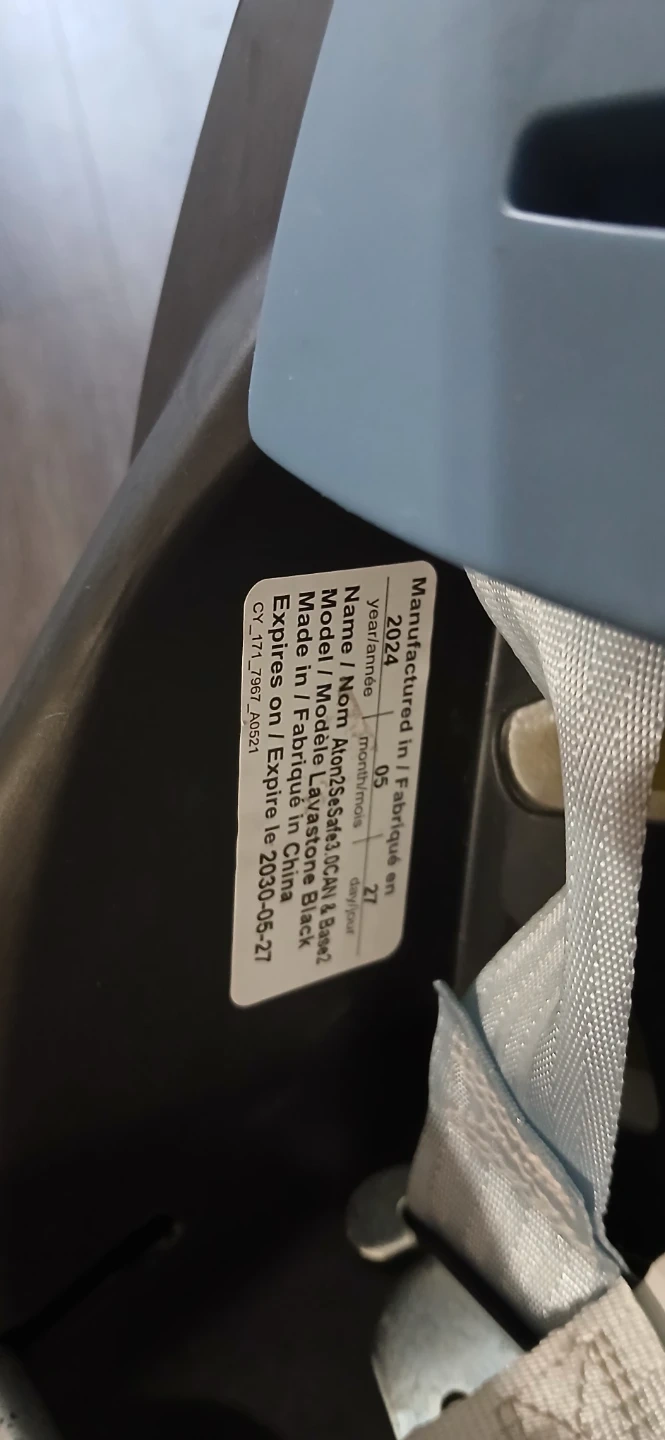 Cybex Aton Sirona car seat in black with a black base. Manufactured in 2024, it expires on May 27, 2030. This car seat is designed for infants and toddlers.