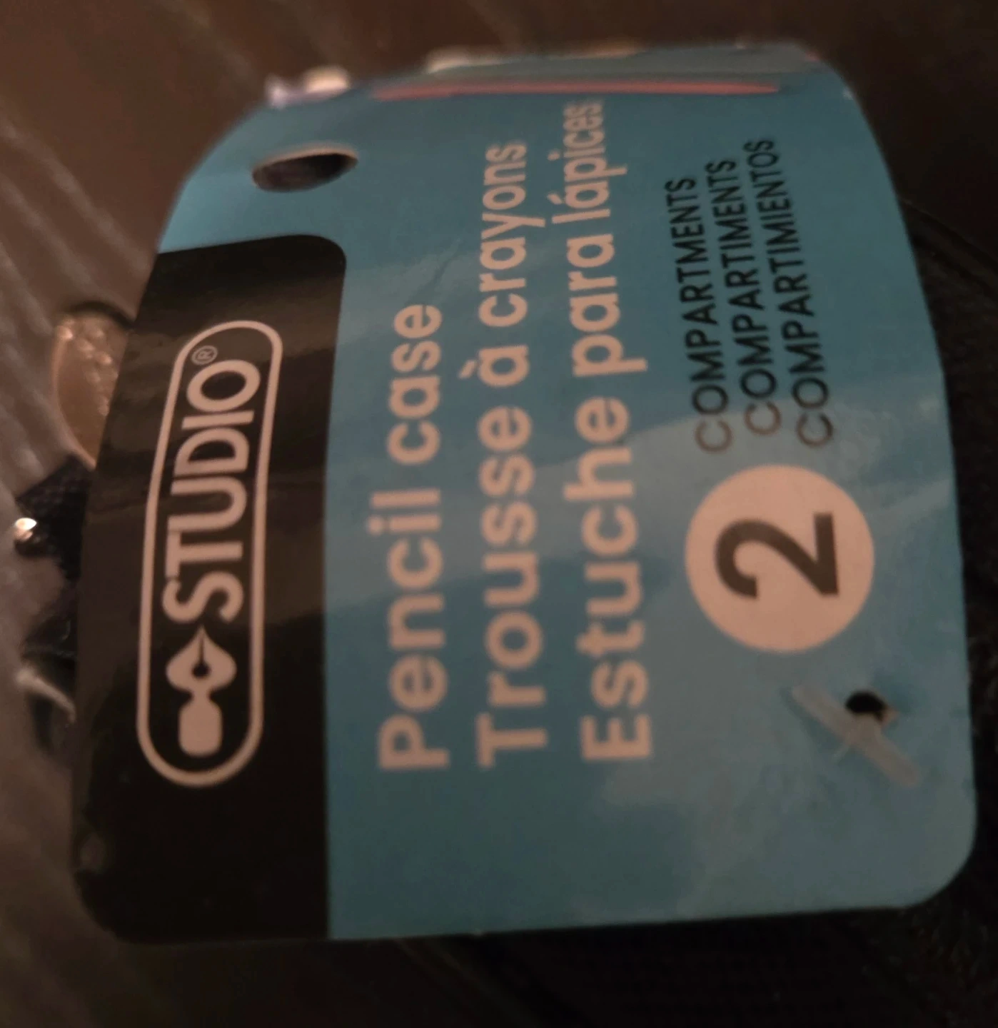 This STUDIO pencil case is black with two zippered compartments. It's a handy size for carrying pens and pencils. Suitable for students or artists on the go!
