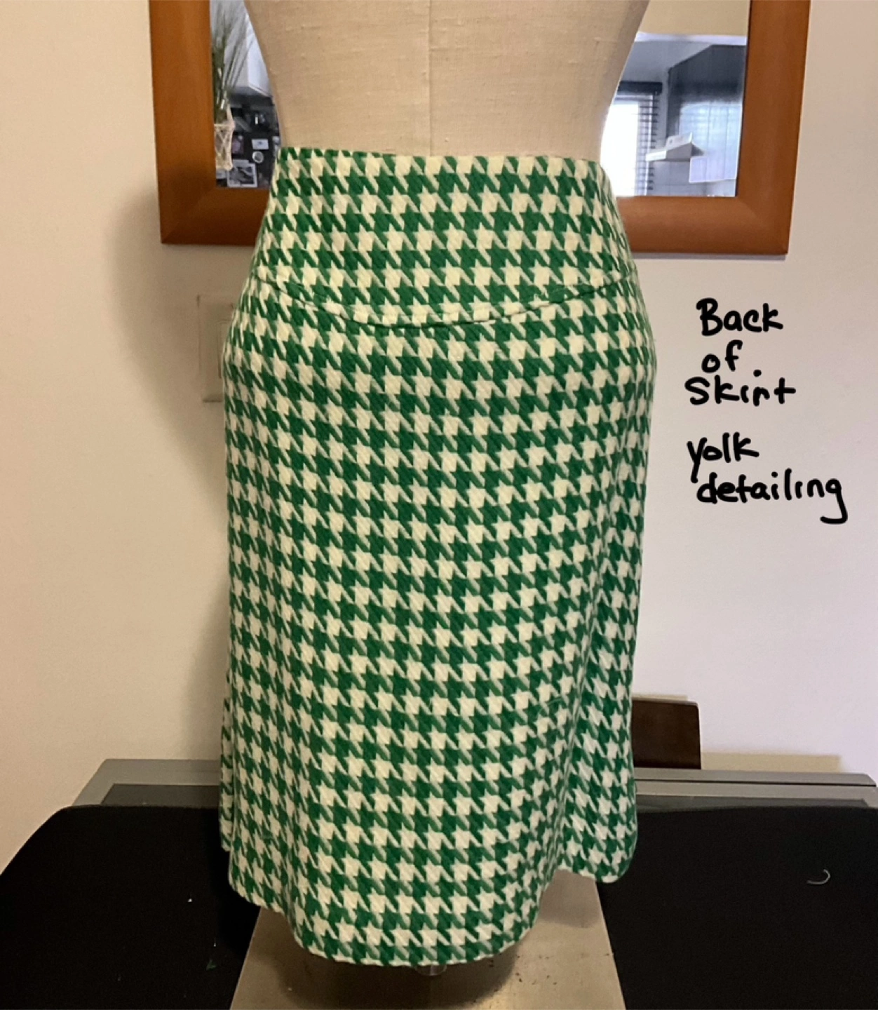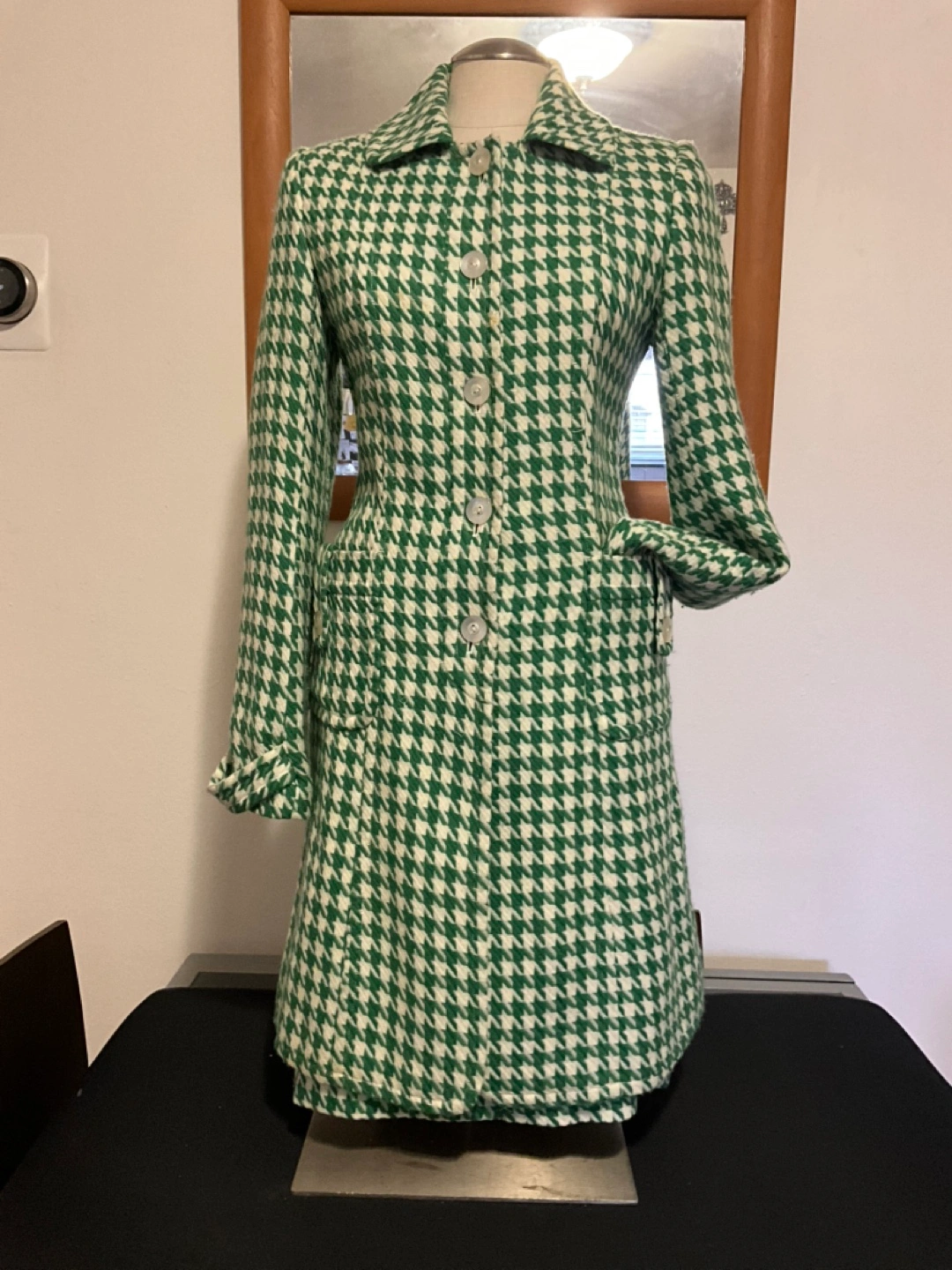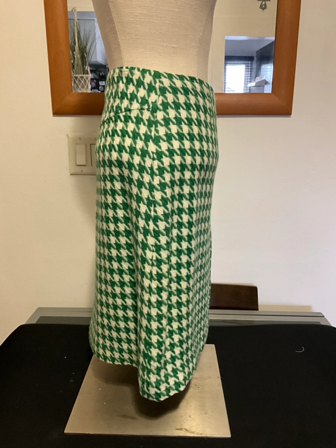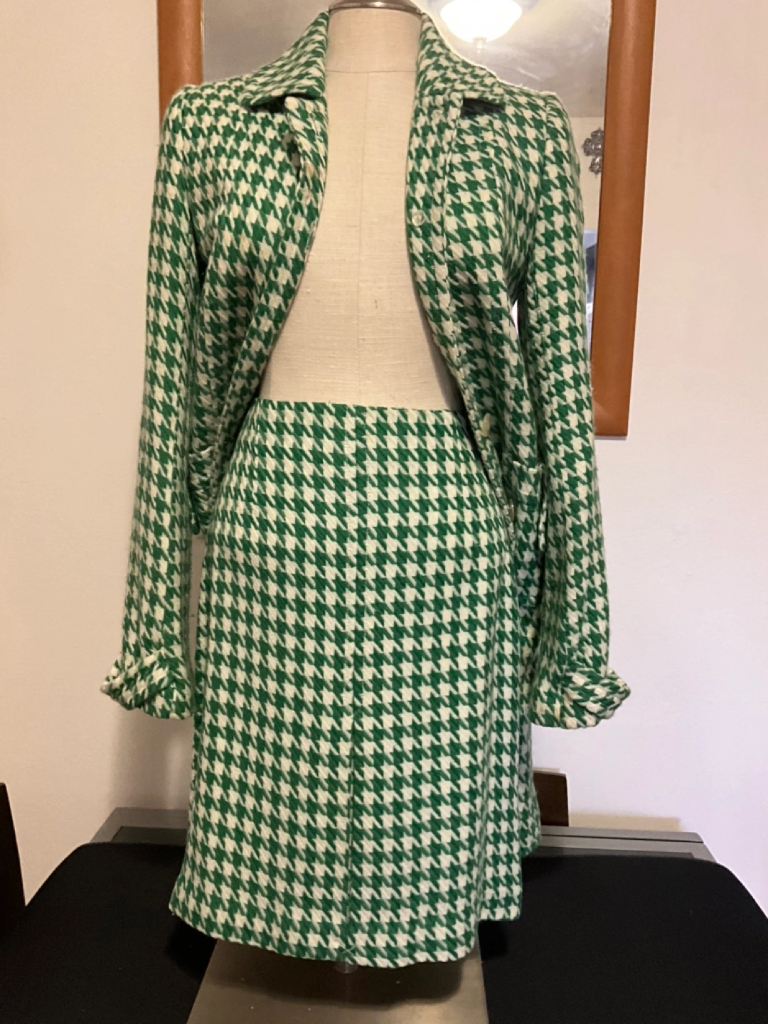 Matching skirt set and coat. Houndstooth pattern in green and white. Button up coat with pockets. Perfect for a formal spring day. Lining is shiny white polyester. Outfit is 50% Wool and 50% Acrylic. Super soft fabric. Skirt never worn and has a kick pleat in the front and yolk detail in the back. Excellent condition. Will consider Best Offer.