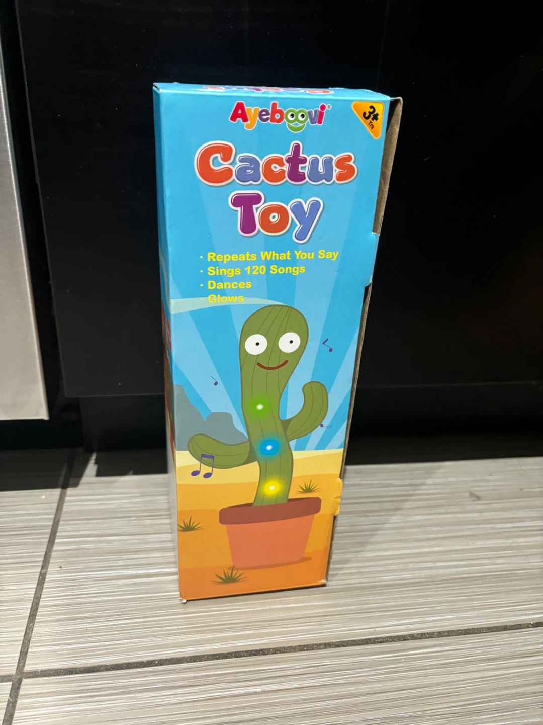 This Ayeboo vi Cactus Toy repeats what you say, sings 120 songs, dances, and glows. It's recommended for ages 3 years and up. This fun toy is sure to entertain little ones!