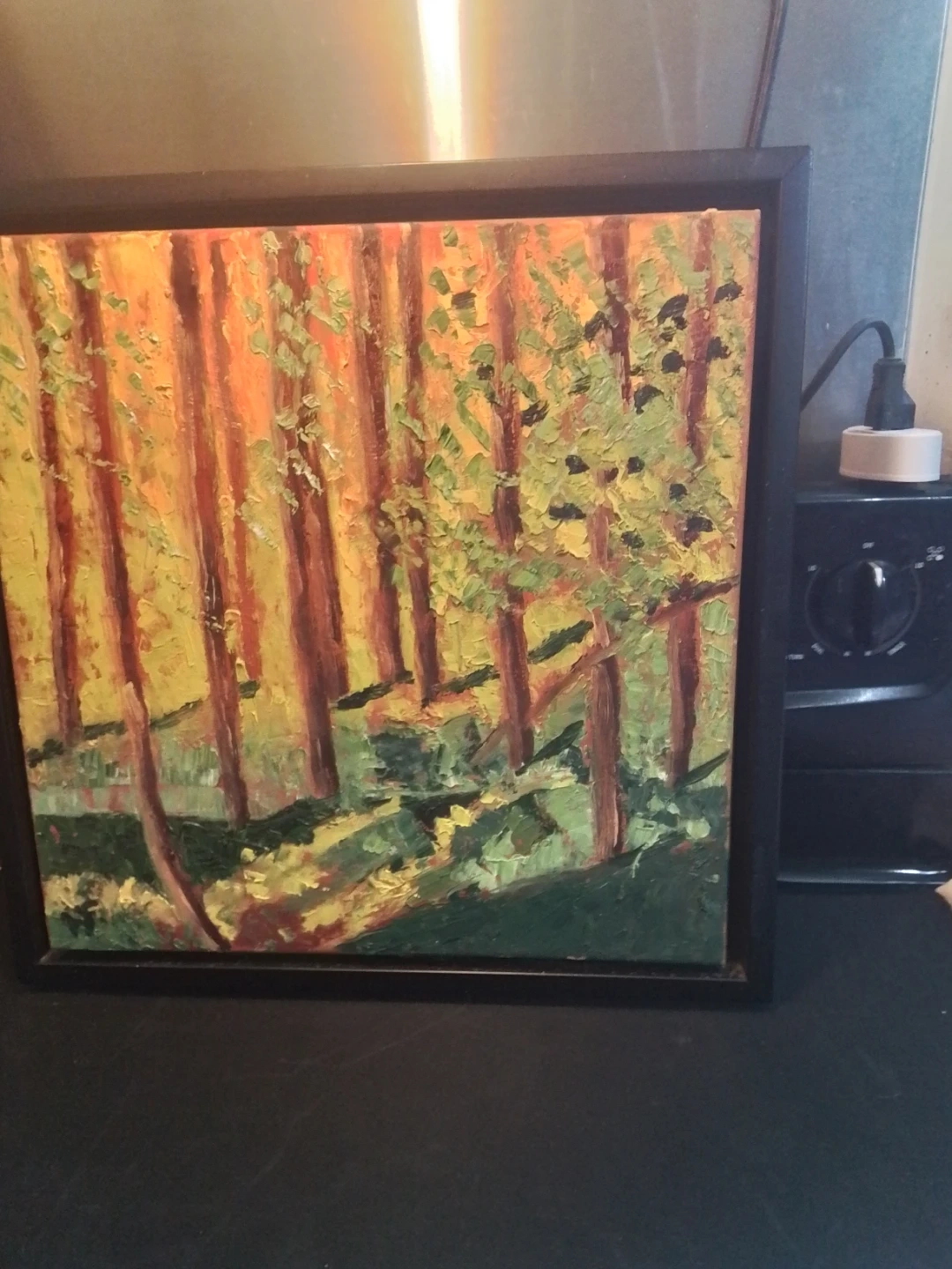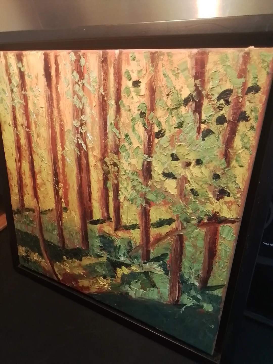 A textured oil painting depicting a forest scene with warm, dappled sunlight. It's framed in black, ready to hang. This piece adds a touch of nature's beauty to any room.