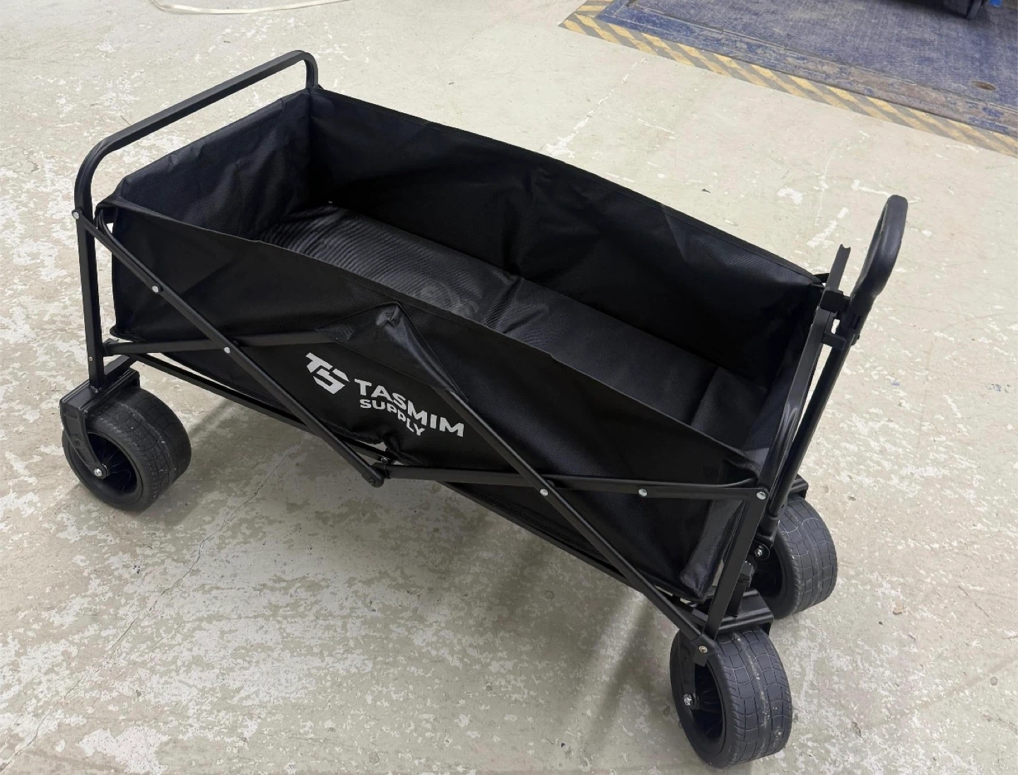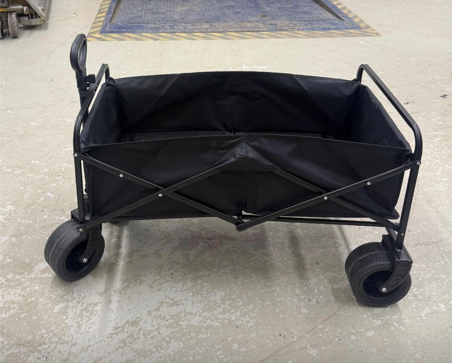 This black wagon is perfect for hauling gear. It's a folding utility wagon with a durable fabric bed and sturdy wheels. Great for camping, beach trips, or yard work!