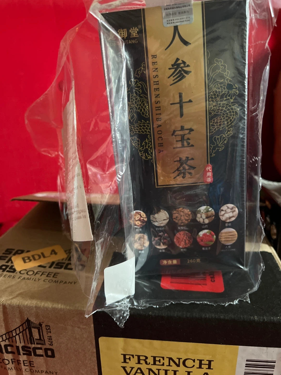 This is a box of Ginseng Ten Treasures Tea. It contains 260 grams of tea. It's made with a blend of herbs and roots.