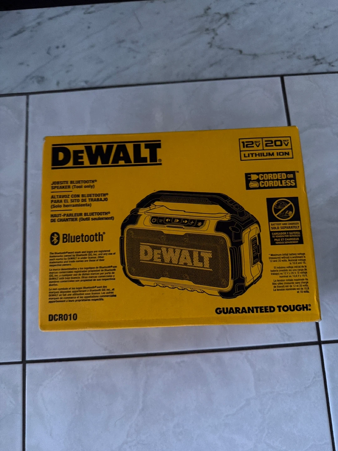 This is a DEWALT Jobsite Bluetooth speaker. It runs on 12V or 20V lithium-ion batteries, and can also be used corded. Battery and charger are sold separately. It's perfect for worksites or garages!