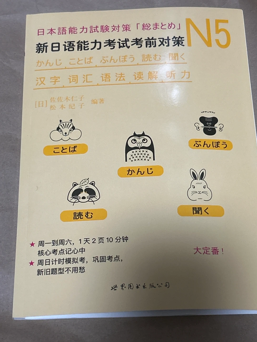 This is a Japanese Language Proficiency Test (JLPT) N5 prep book for the 'Sogomatome' series. It covers kanji, vocabulary, grammar, reading, and listening. The book is designed for daily study, with a suggested 10-minute study session per day.