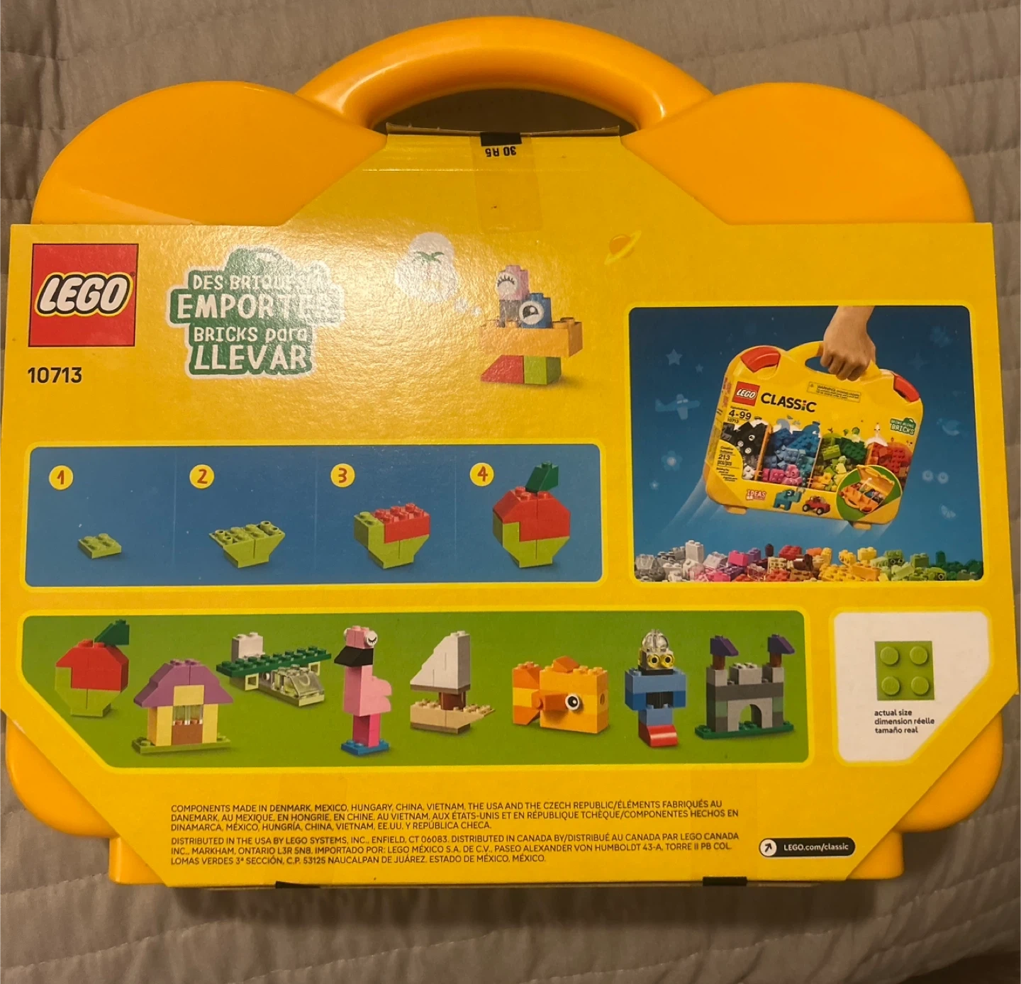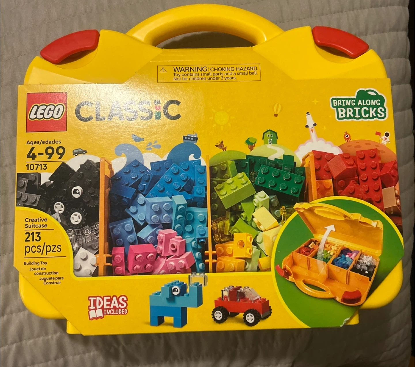 This is a LEGO Classic Creative Suitcase with 213 pieces. It's a building toy designed for ages 4-99. The suitcase is yellow and includes various coloured bricks for creative building.