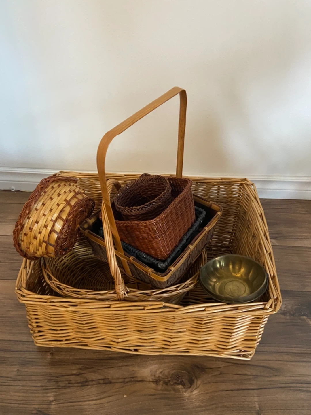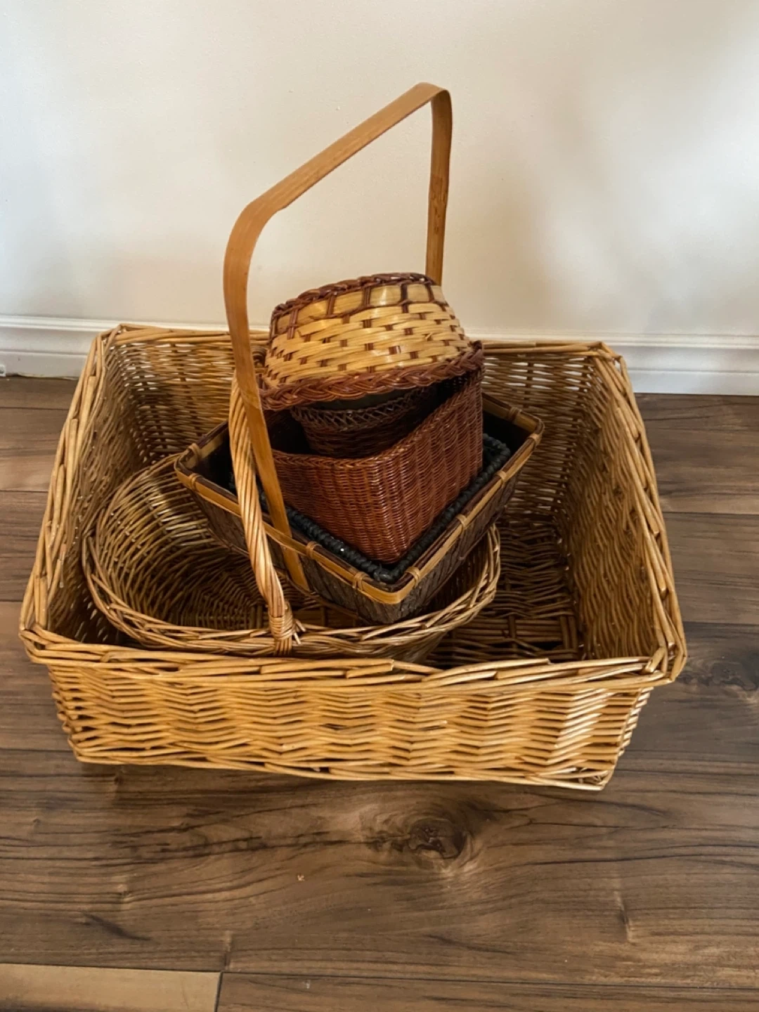 Selling a set of wicker baskets. They come in various sizes and would be perfect for storage or decoration around the house. They're in great condition and ready for a new home!