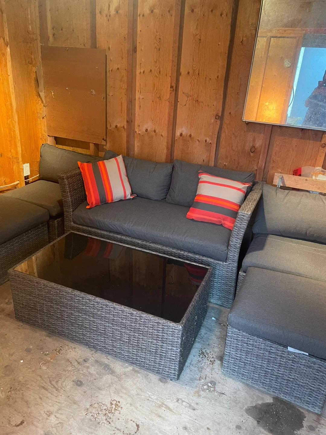 65Looking to sell this stylish wicker outdoor patio set. It includes a sofa, two ottomans, and a coffee table with a glass top. The set is perfect for enjoying the outdoors in comfort and style. The cushions are a neutral grey colour that will match any decor. It's in great condition and ready for a new home!