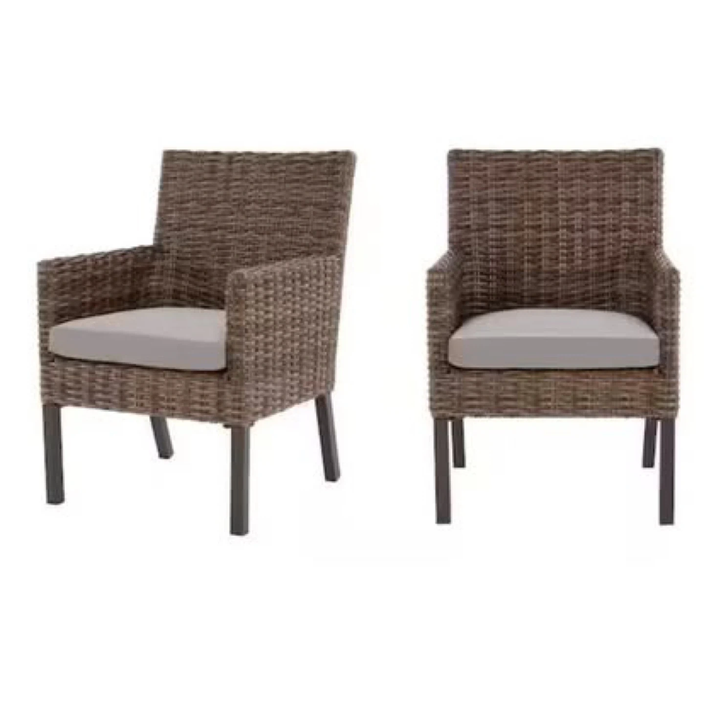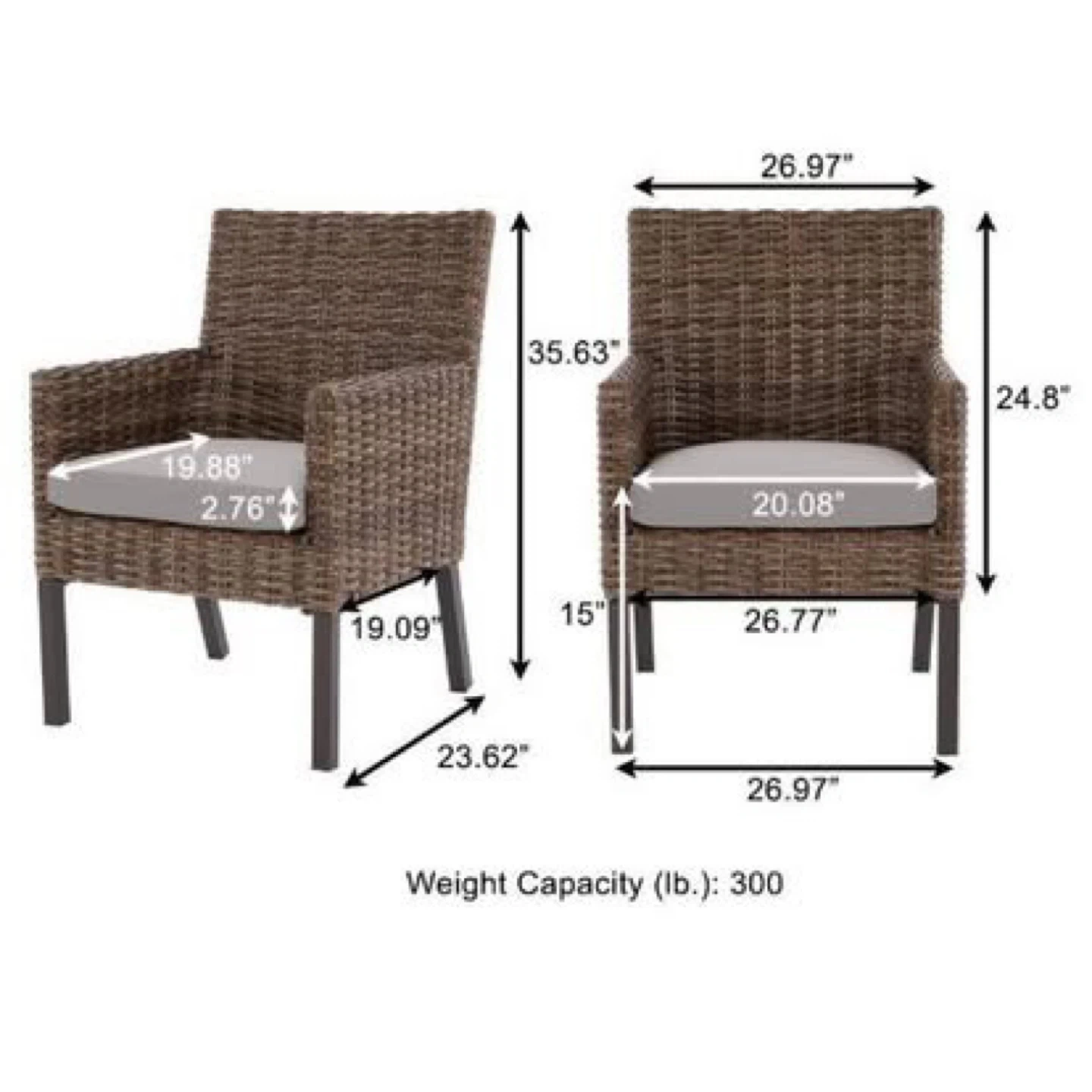 60Selling a lovely wicker patio armchair! It comes with a comfy cushion. Here are the approximate dimensions: - Height: 35.63" - Width: 26.97" - Depth: 23.62" - Seat height: 15" It can hold up to 300 lbs