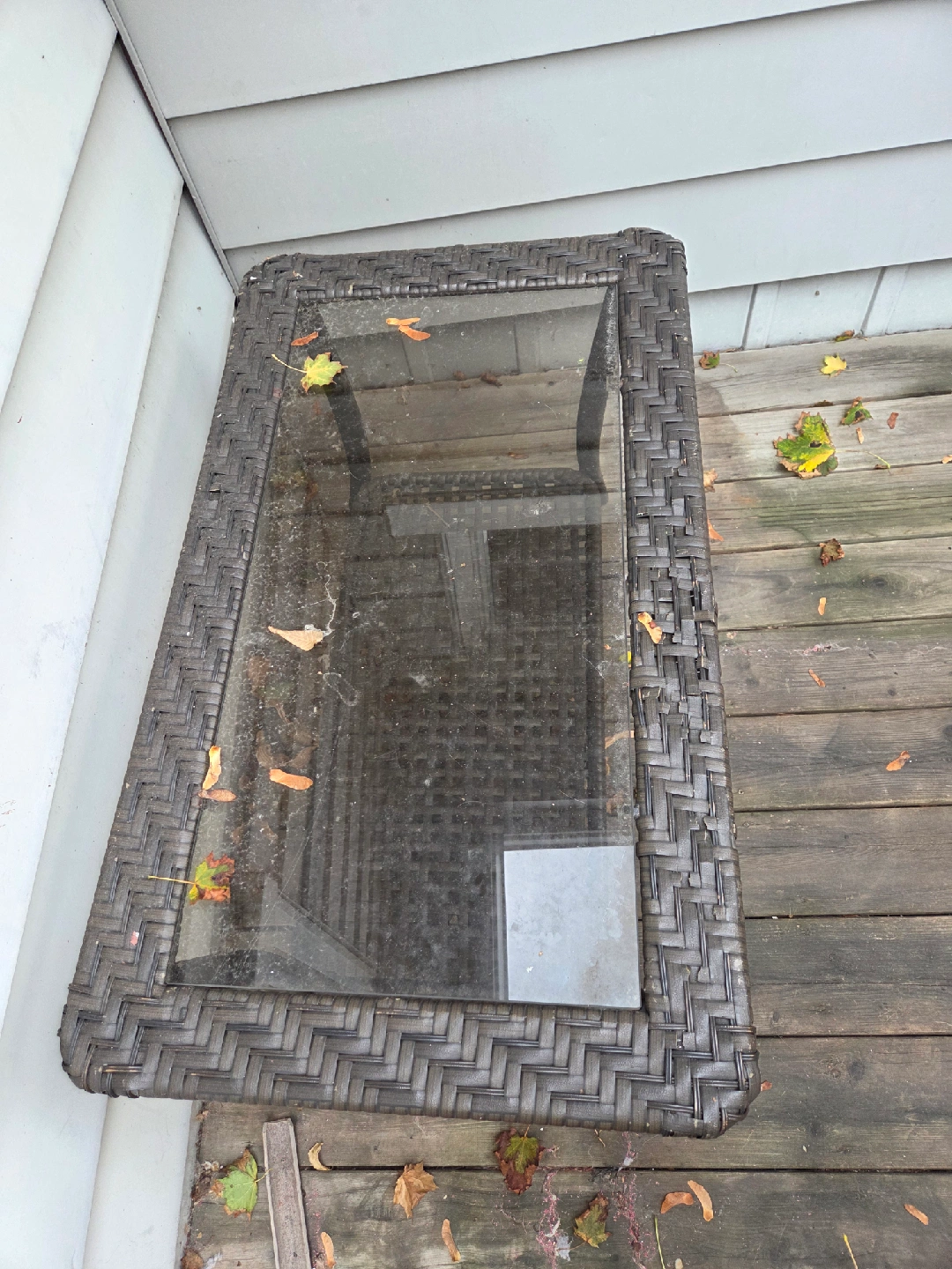 83Selling a wicker patio coffee table with a glass top. It's perfect for outdoor use and adds a touch of style to your patio or deck. It is in used condition.