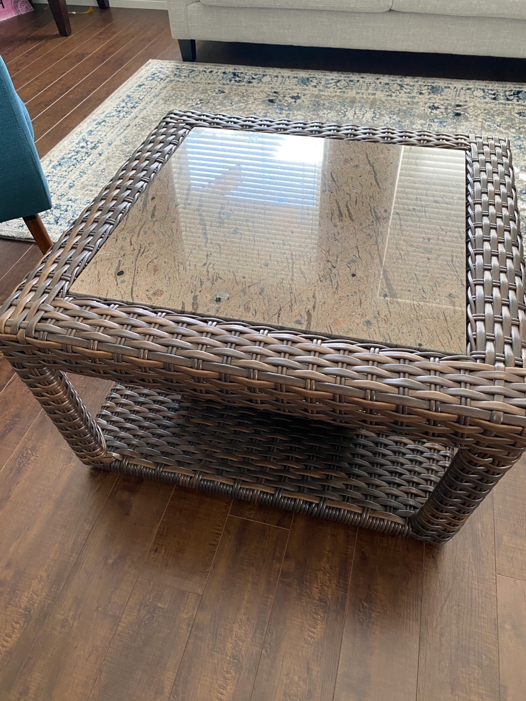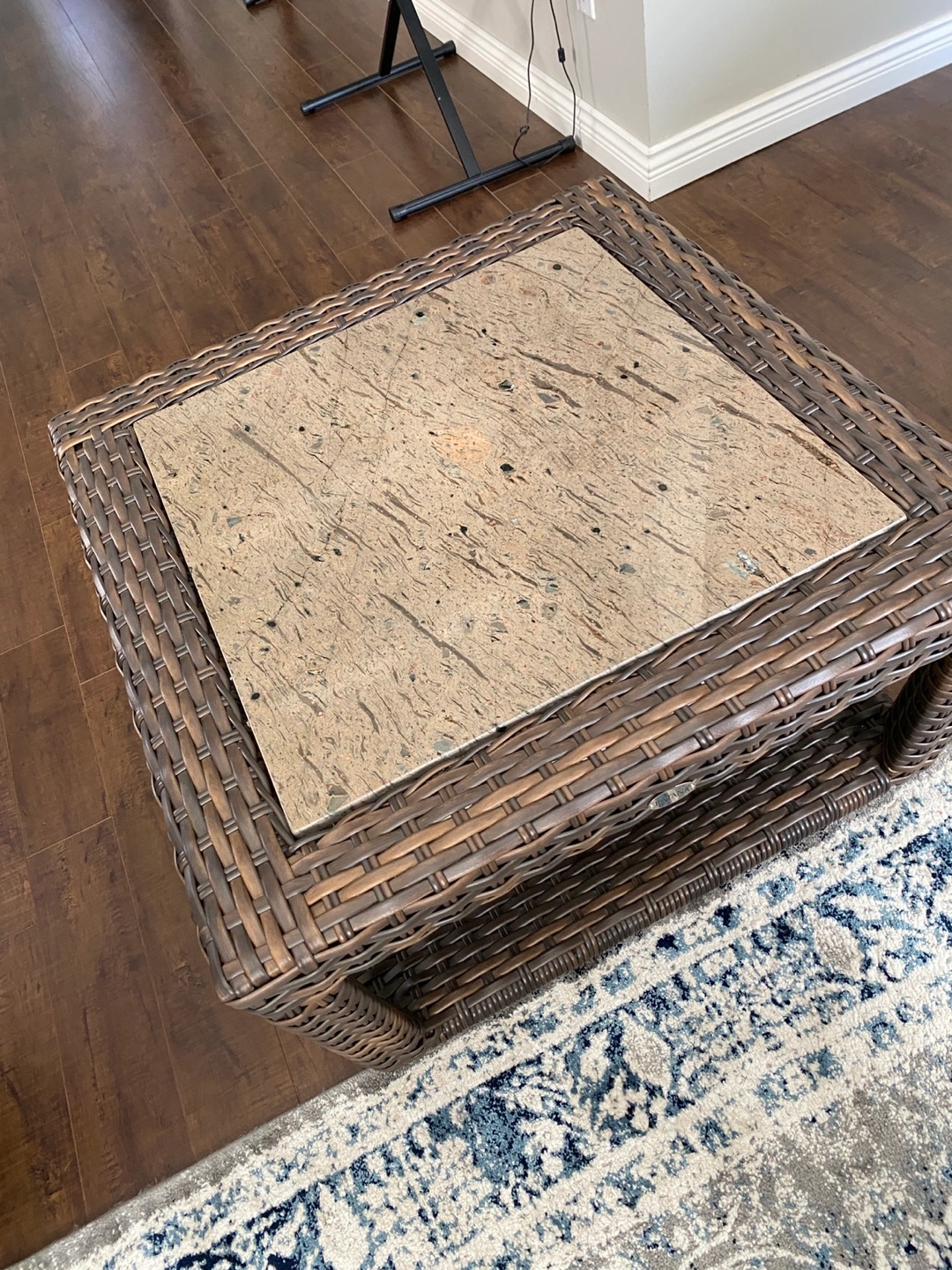 Square coffee table. Brown wicker frame. Garnite top. Lower shelf. Perfect for patio or indoor use.