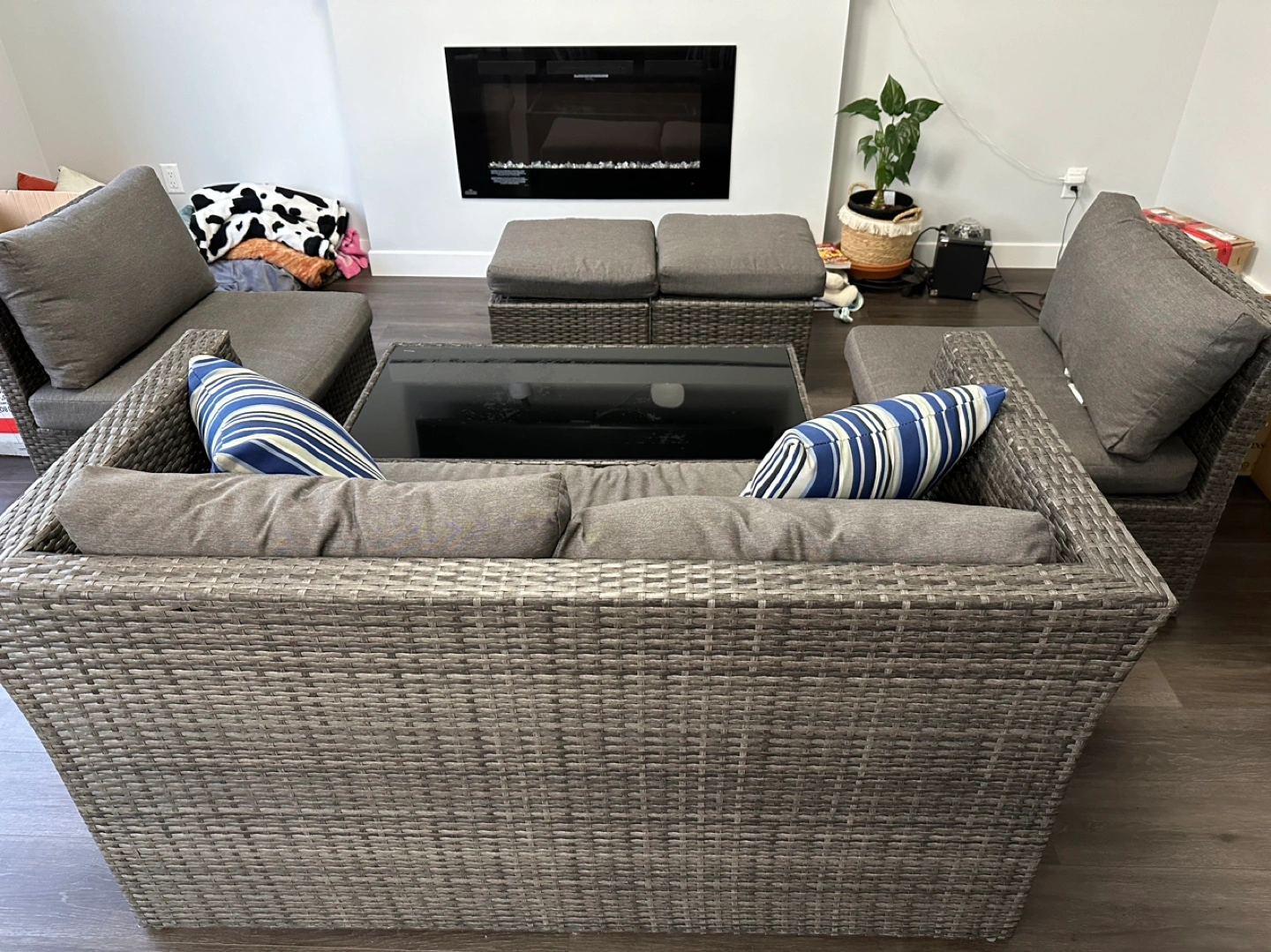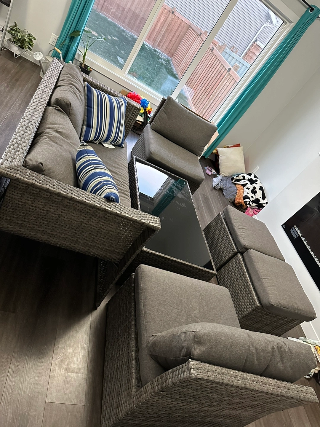 10Six piece wicker patio furniture set. Includes a loveseat, two chairs, two ottomans, and a coffee table with glass top.