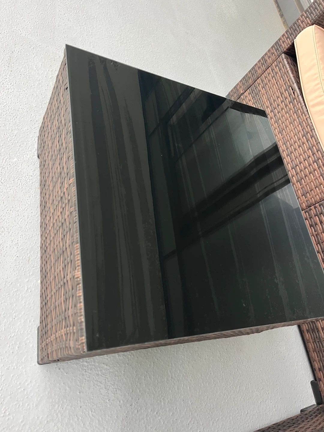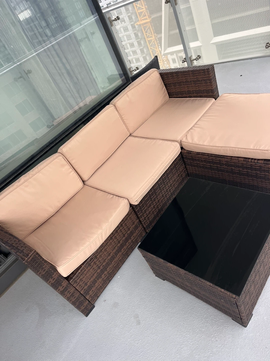 10Selling a wicker patio set that includes a comfy sectional sofa and a sleek coffee table with a glass top. The set is in great shape and perfect for enjoying those summer evenings on your balcony or patio. The cushions are a neutral beige colour and the wicker is a rich brown tone. This set will definitely add a touch of style to your outdoor space!