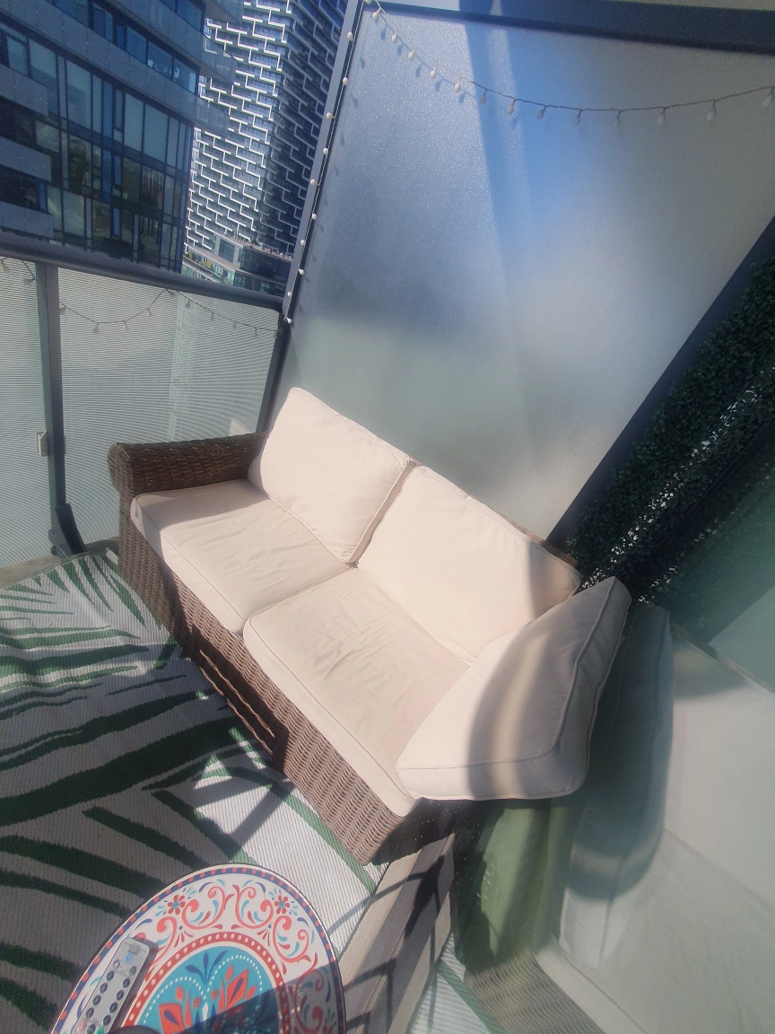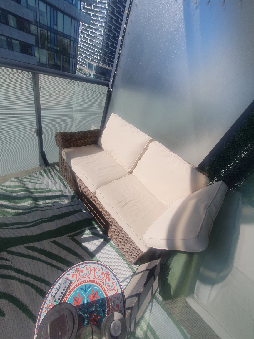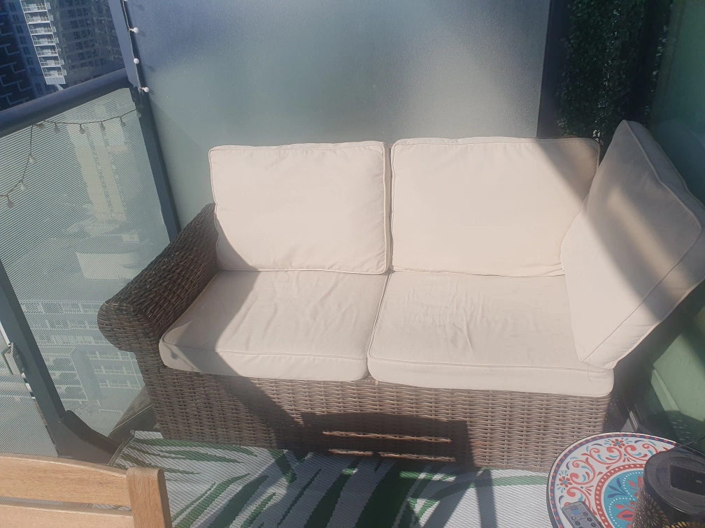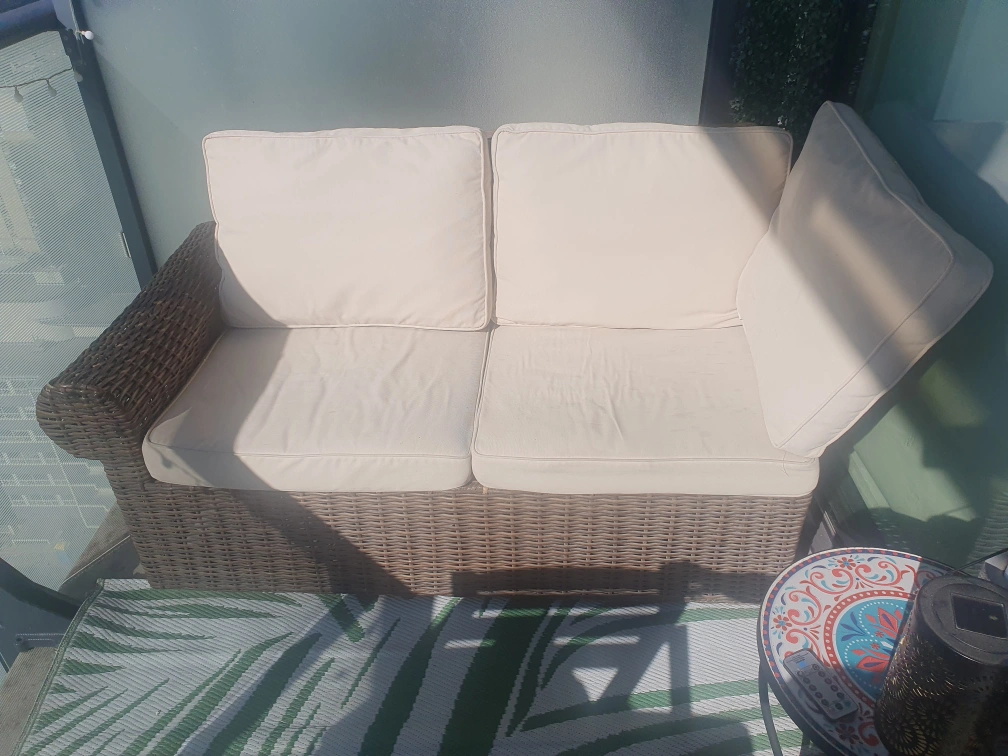 53Outdoor wicker sofa with beige cushions. Great for a balcony or patio.