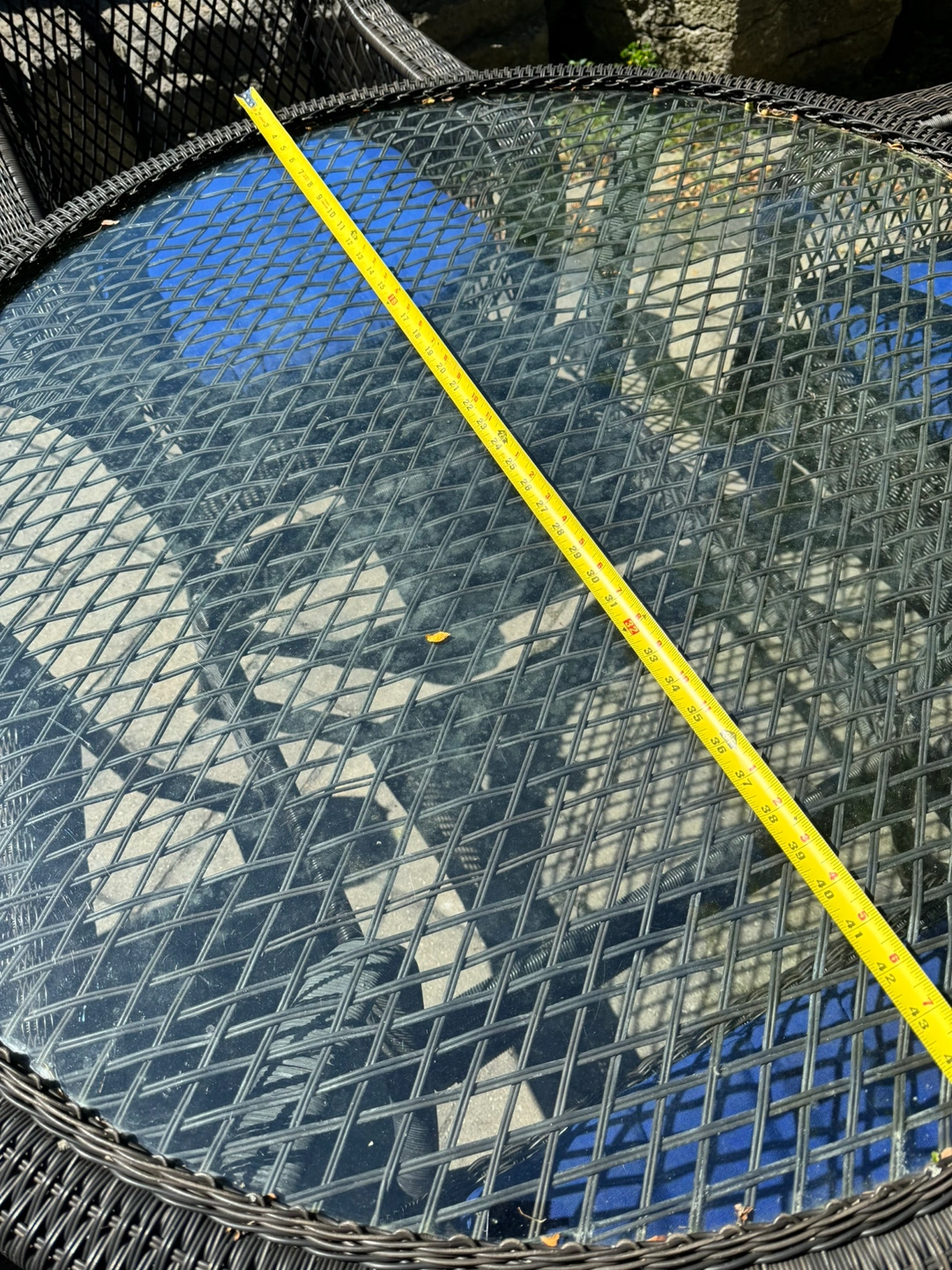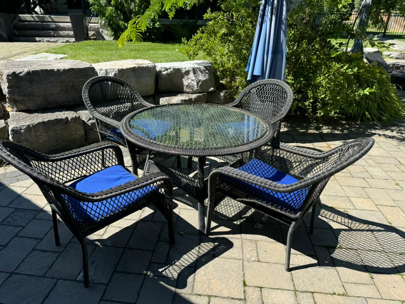 Four chairs, a table, and four blue cushions. The table top is glass. The chairs are wicker and have blue cushions. Table is 48”. Decent condition. Pick up only Southwest Pickering.