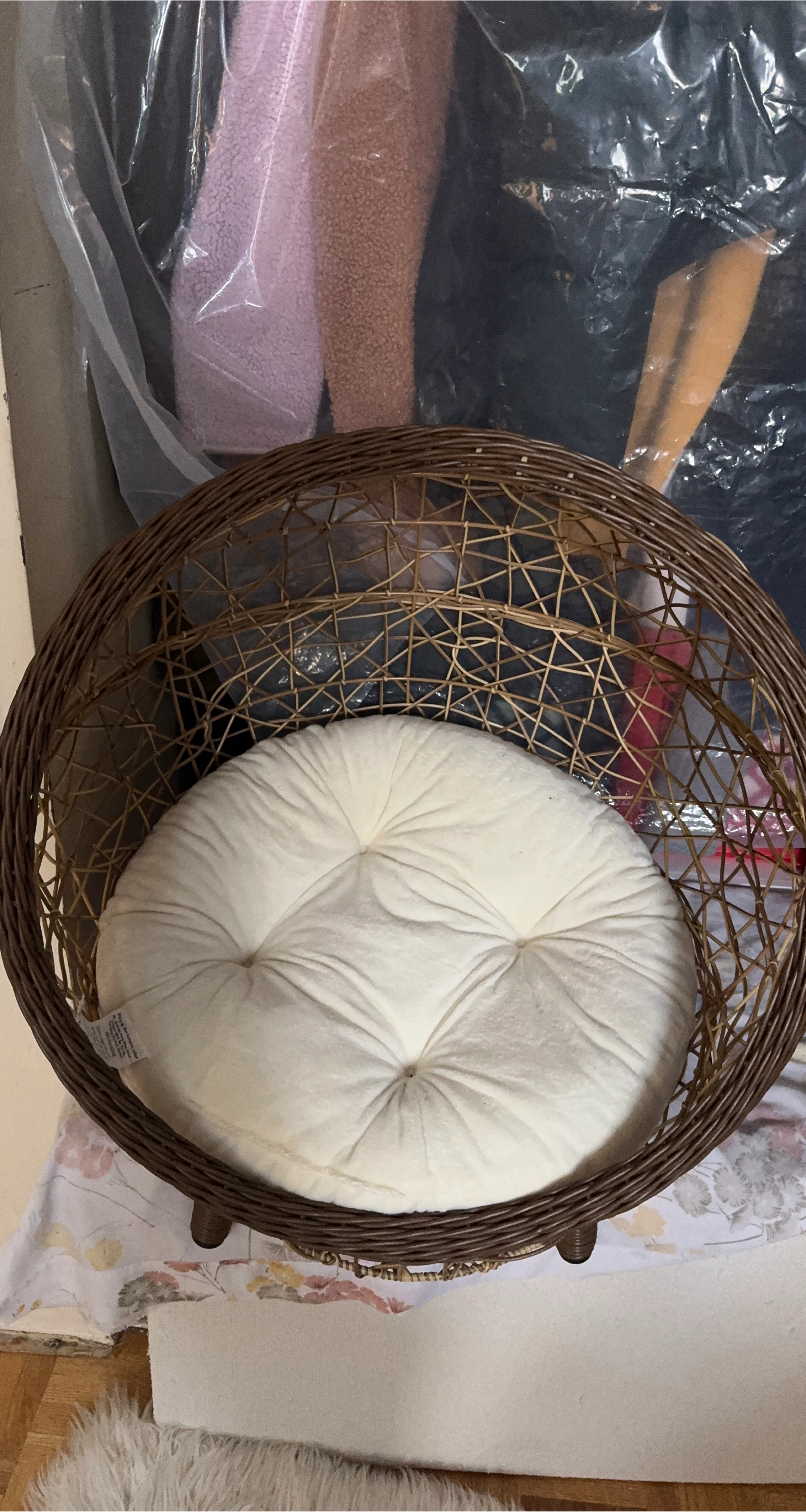 60Selling a cozy wicker pet bed with a soft, tufted cushion! It's perfect for cats or small dogs who love to curl up in a comfy space. The bed is in great shape and ready for a new furry friend.