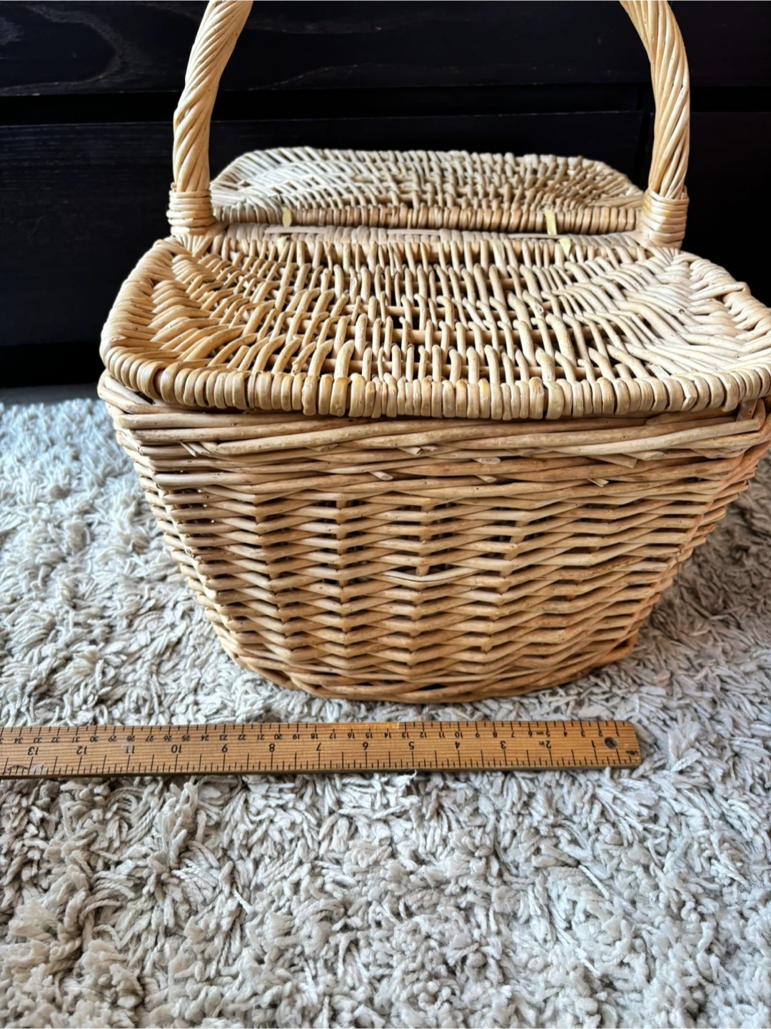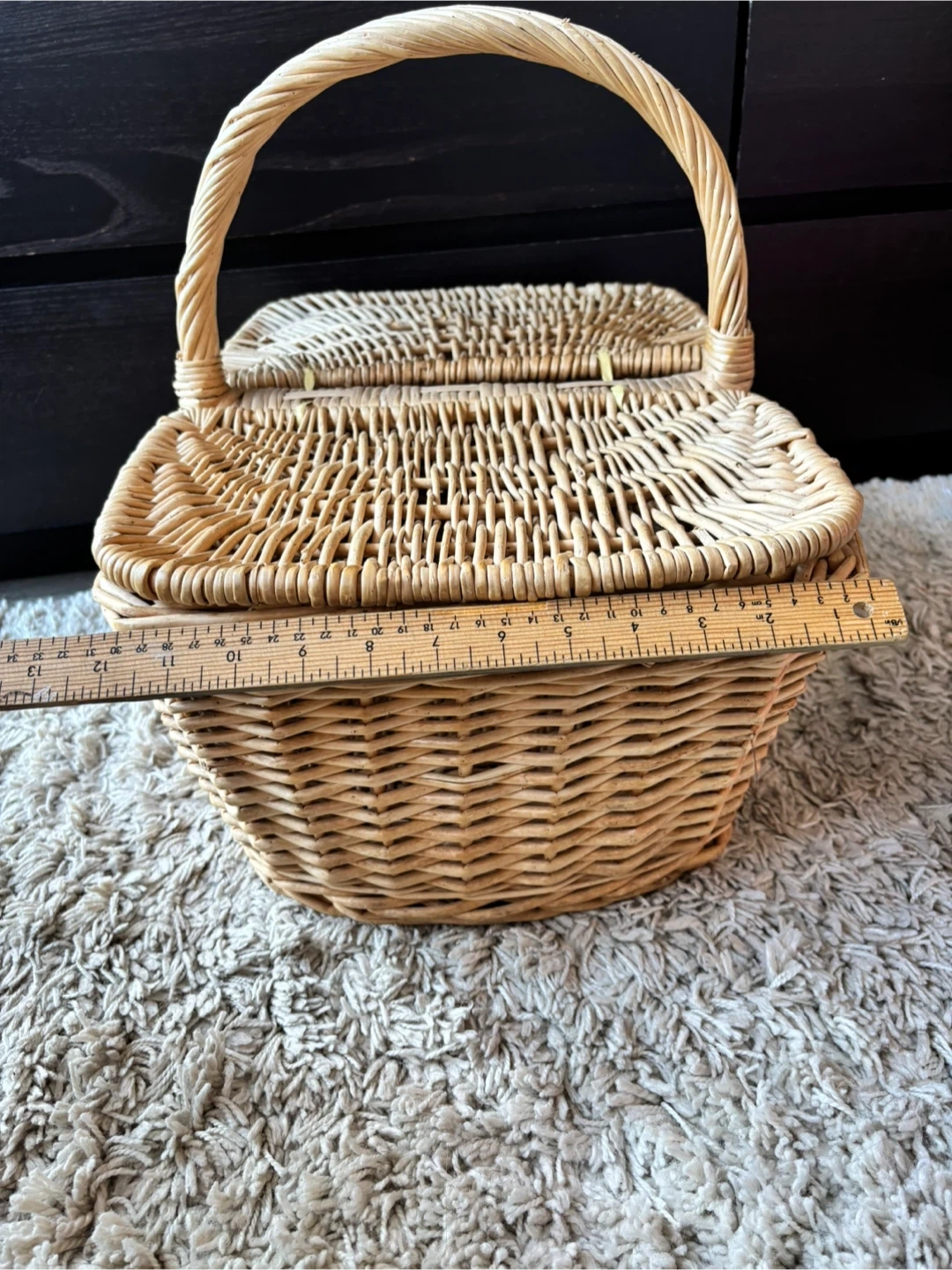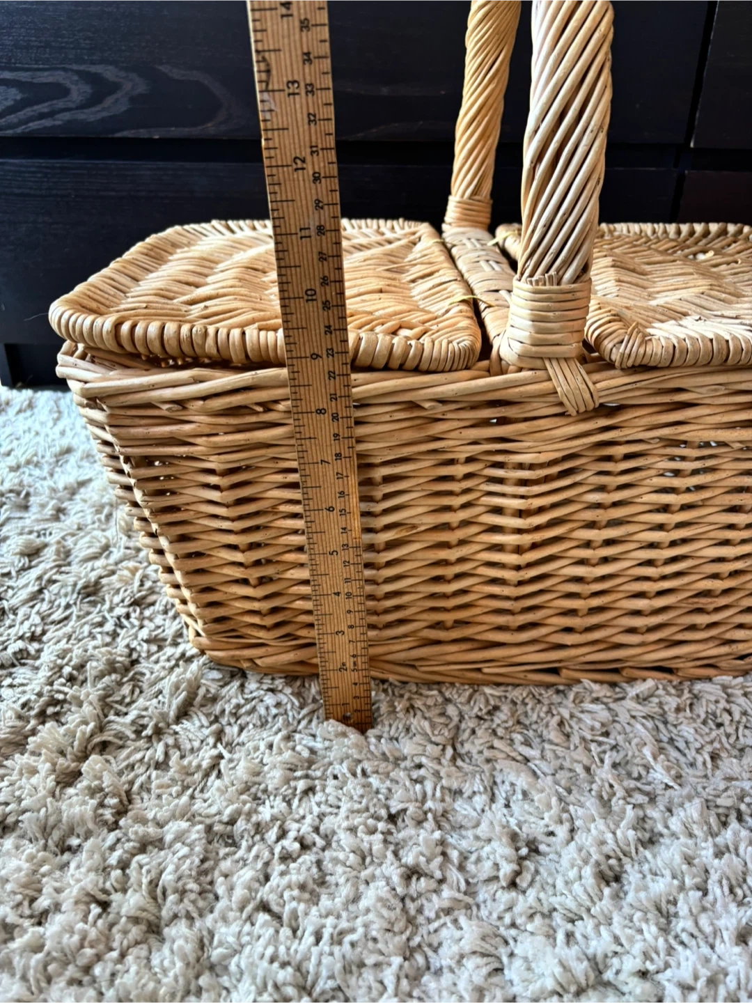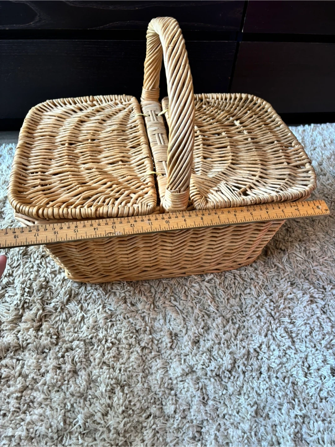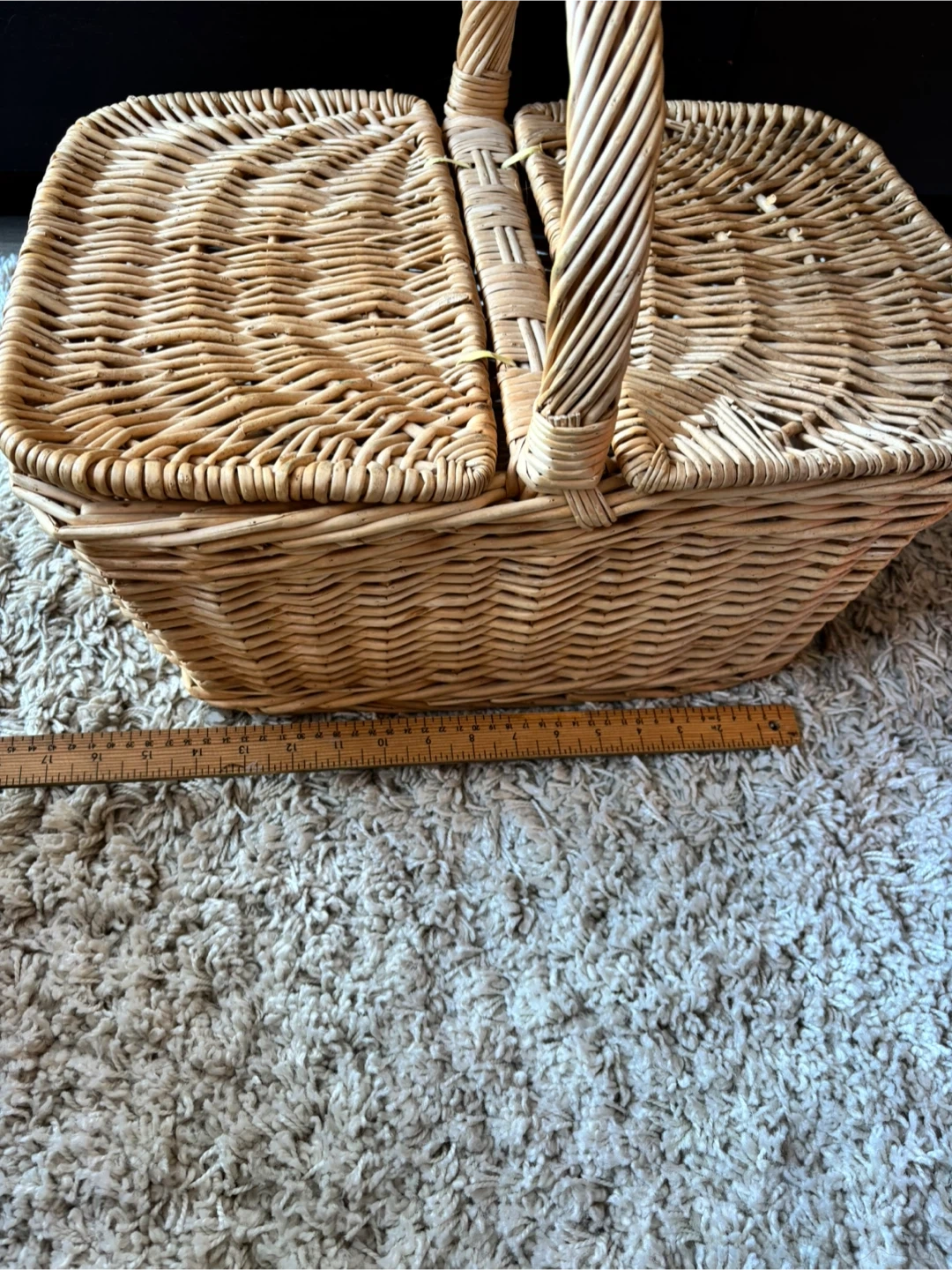 Selling a wicker picnic basket. It's in great shape and perfect for outdoor adventures or cozy indoor storage. The basket has a hinged lid and a sturdy handle for easy carrying. It's a charming addition to any home or picnic setup. I took many pictures with a ruler for your convenience, it's a spacious basket.