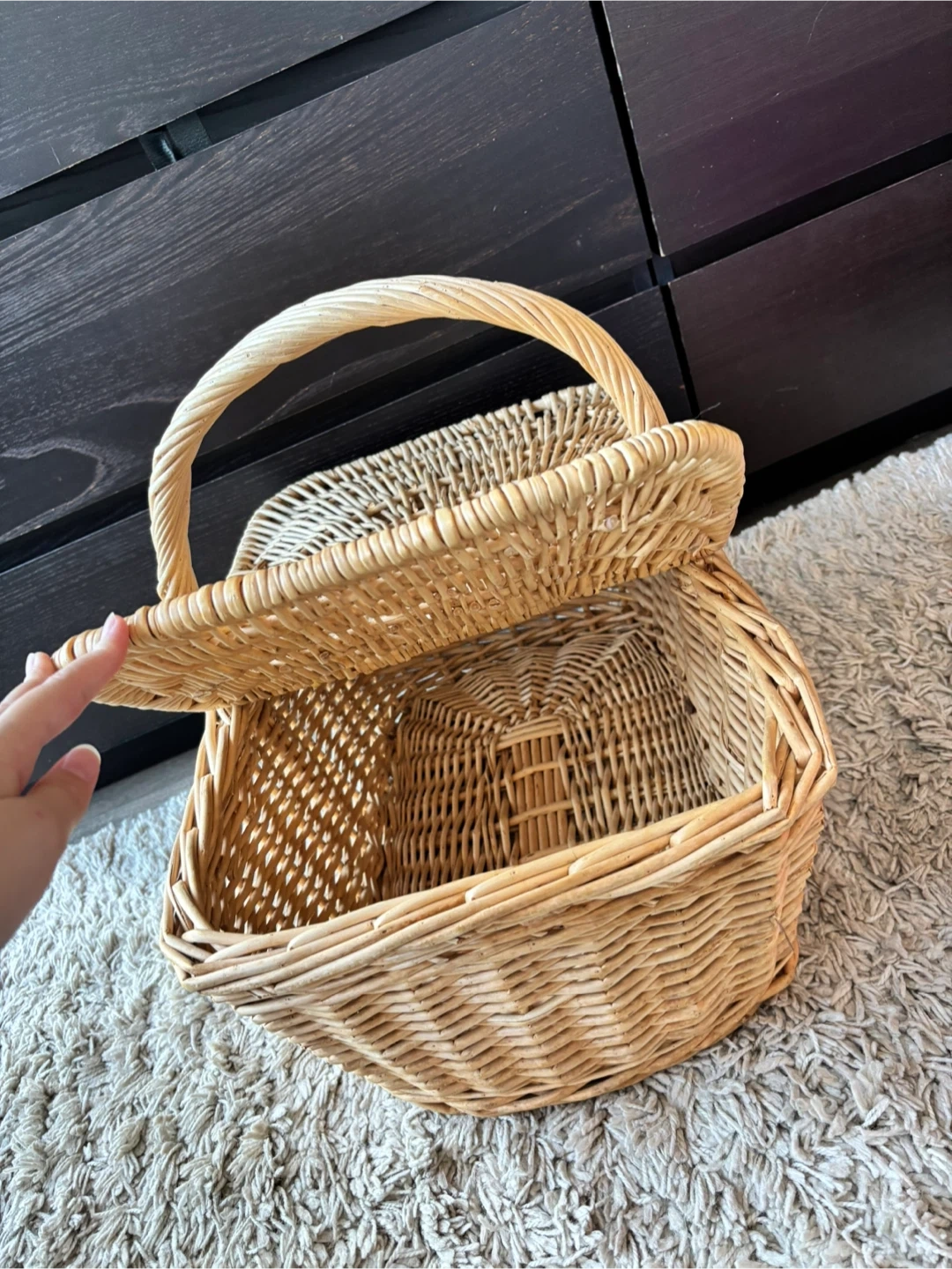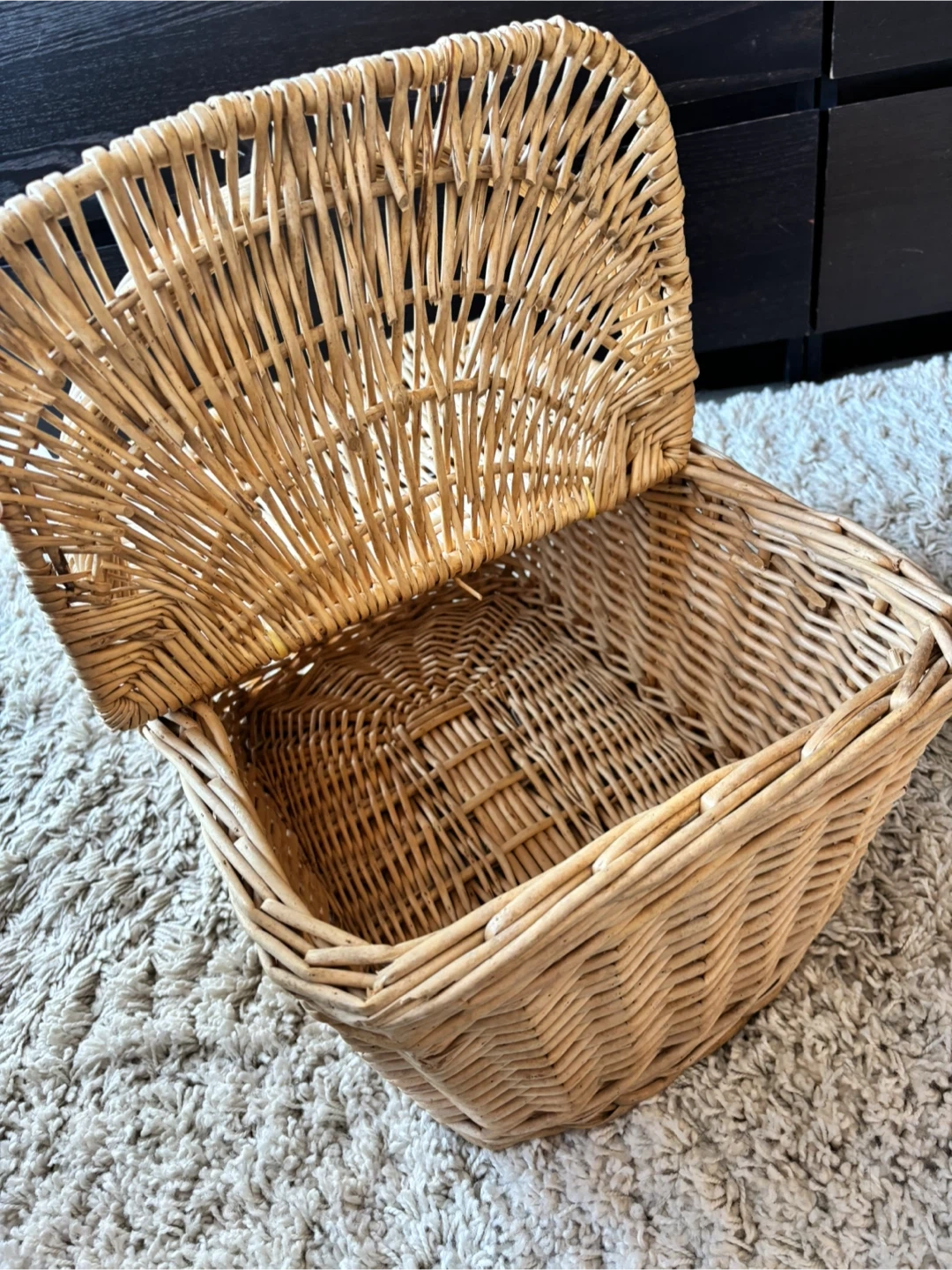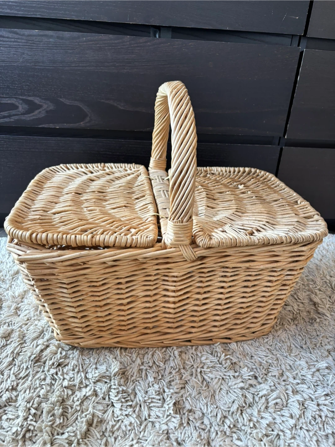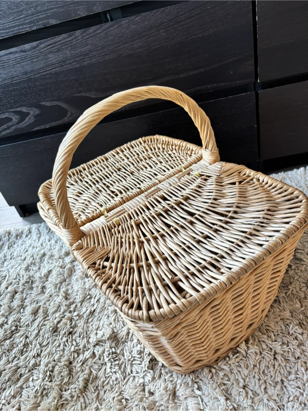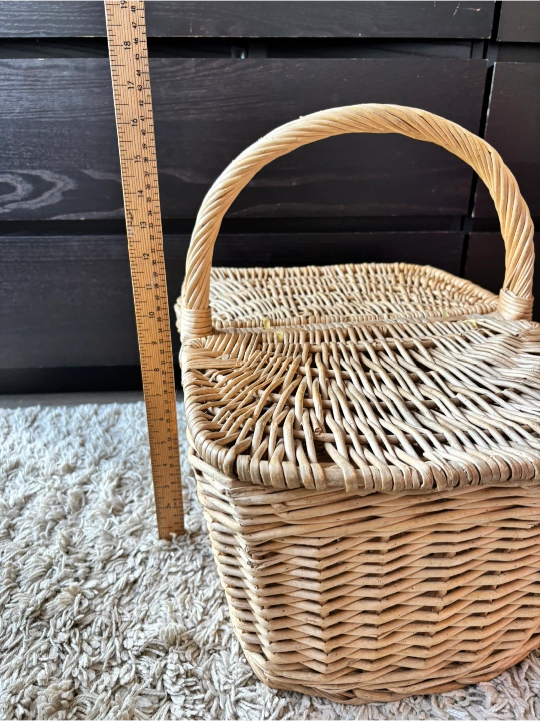 Selling a wicker picnic basket. It's in great shape and perfect for outdoor adventures or cozy indoor storage. The basket has a hinged lid and a sturdy handle for easy carrying. It's a charming addition to any home or picnic setup. I took many pictures with a ruler for your convenience, it's a spacious basket.