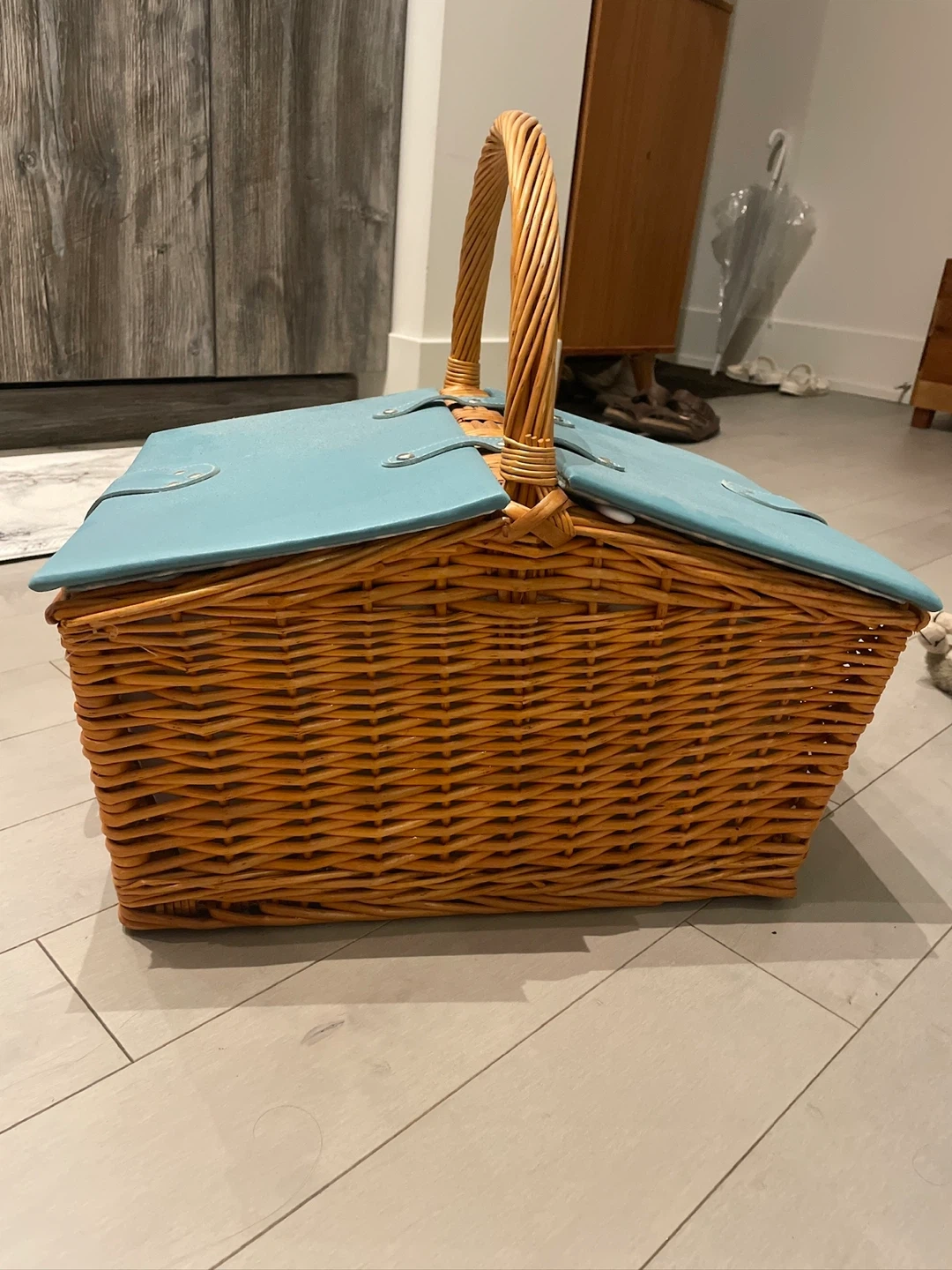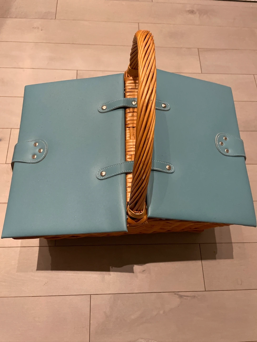 Picnic basket with cutlery, plates, and salt and pepper shakers included! It's in great shape and ready for your next outdoor adventure