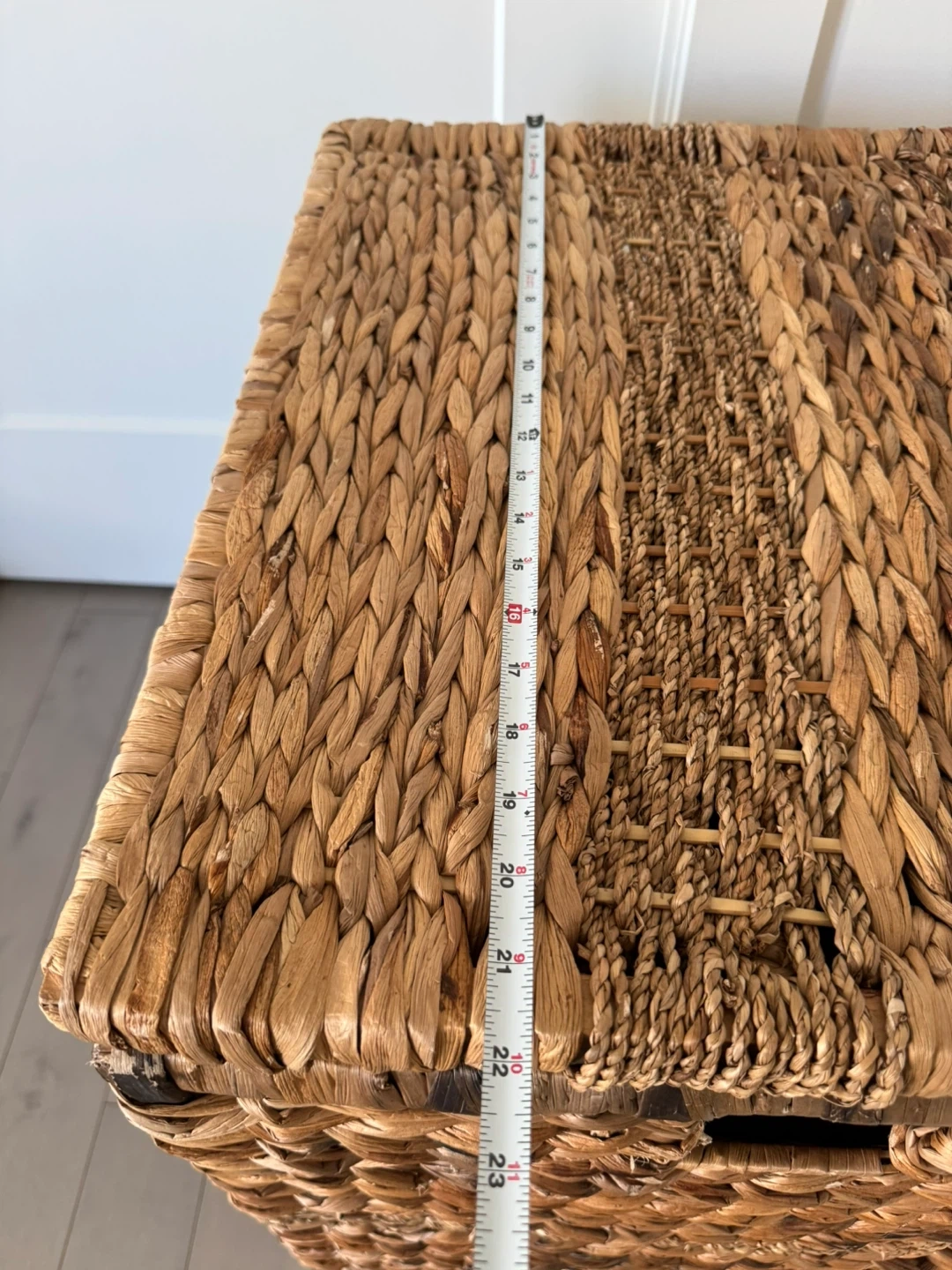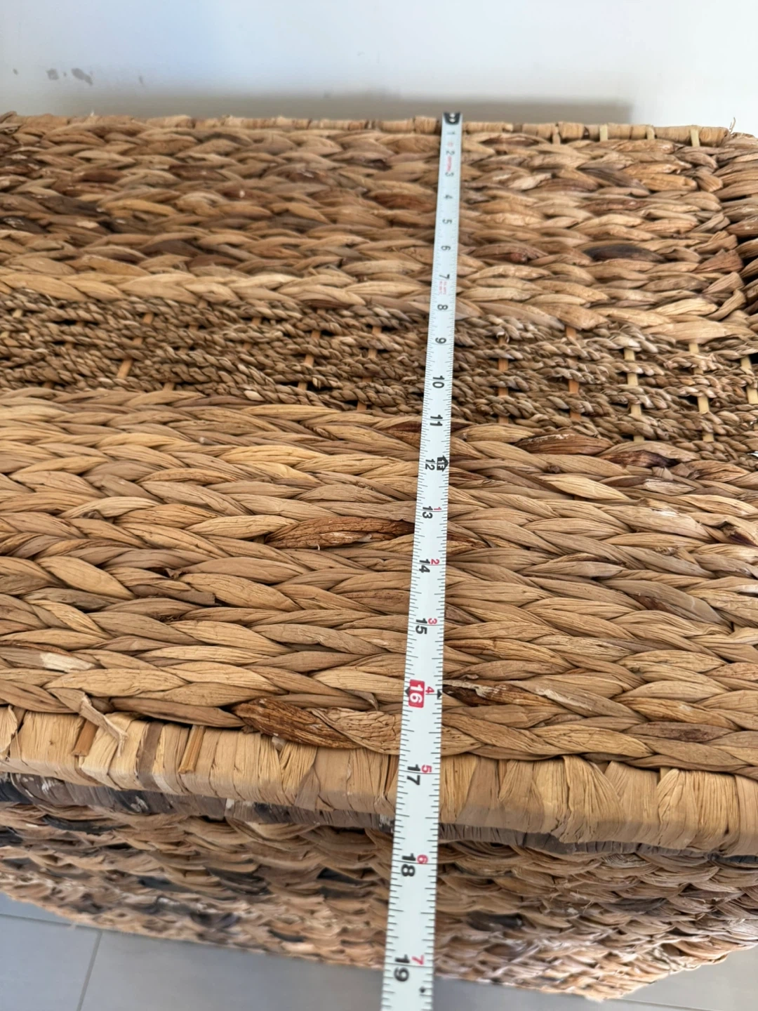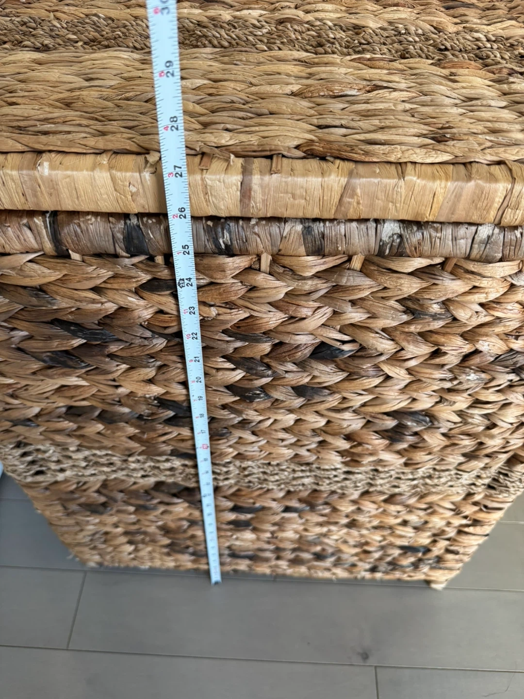 Here's a wicker storage basket with a lid, perfect for keeping things tidy! It measures approximately 22 inches in height, 18 inches in width, and 18 inches in depth. It's in great condition and ready for a new home!