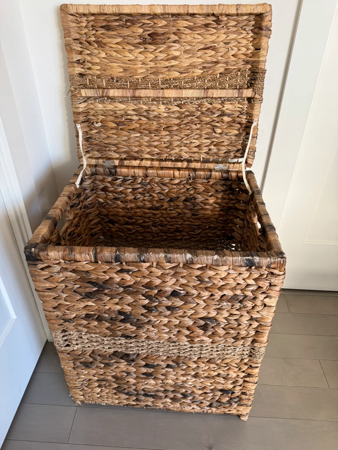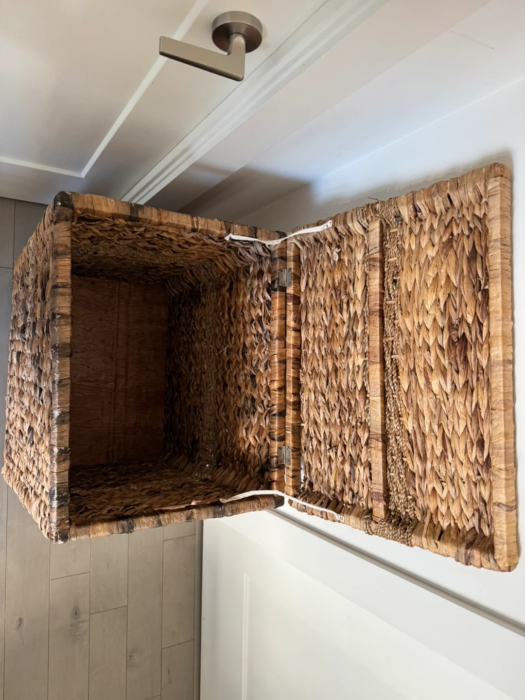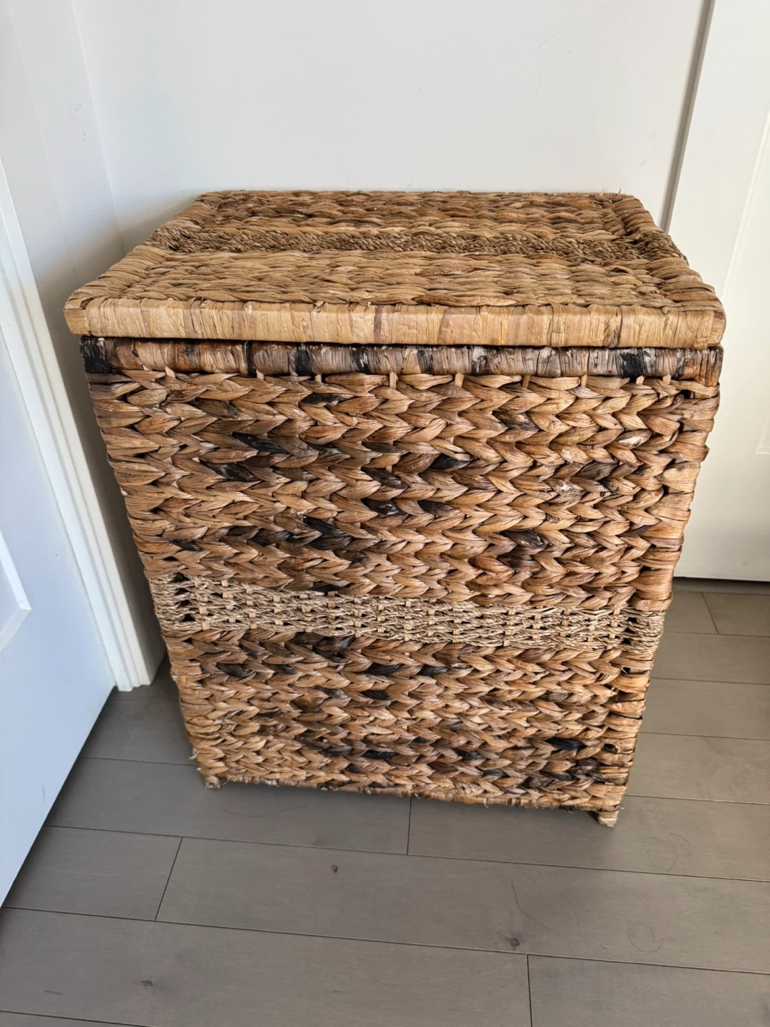 Here's a wicker storage basket with a lid, perfect for keeping things tidy! It measures approximately 22 inches in height, 18 inches in width, and 18 inches in depth. It's in great condition and ready for a new home!
