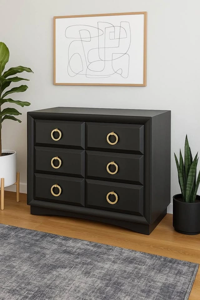 62Beautiful solid wood Widdicomb mid-century dresser, freshly refinished in a smooth matte black with gold hardware. It’s a vintage piece with amazing quality and clean modern lines — now updated with a bold, timeless look. Details: • Authentic Widdicomb Furniture Co. mid-century piece (1950s–60s) • Original Price: $3500+ • Refinished by hand — matte black paint with gold ring pulls • Three spacious drawers with solid wood interiors • Classic tapered legs and sleek, minimal design on wheels • Dimensions: 36 length, 20 width, 33 height This dresser adds character and warmth to any space — perfect for a bedroom, entryway, or as an accent piece in a modern home. 📍 Located in: Ville St-Laurent 🚗 Pickup only — I can help load it