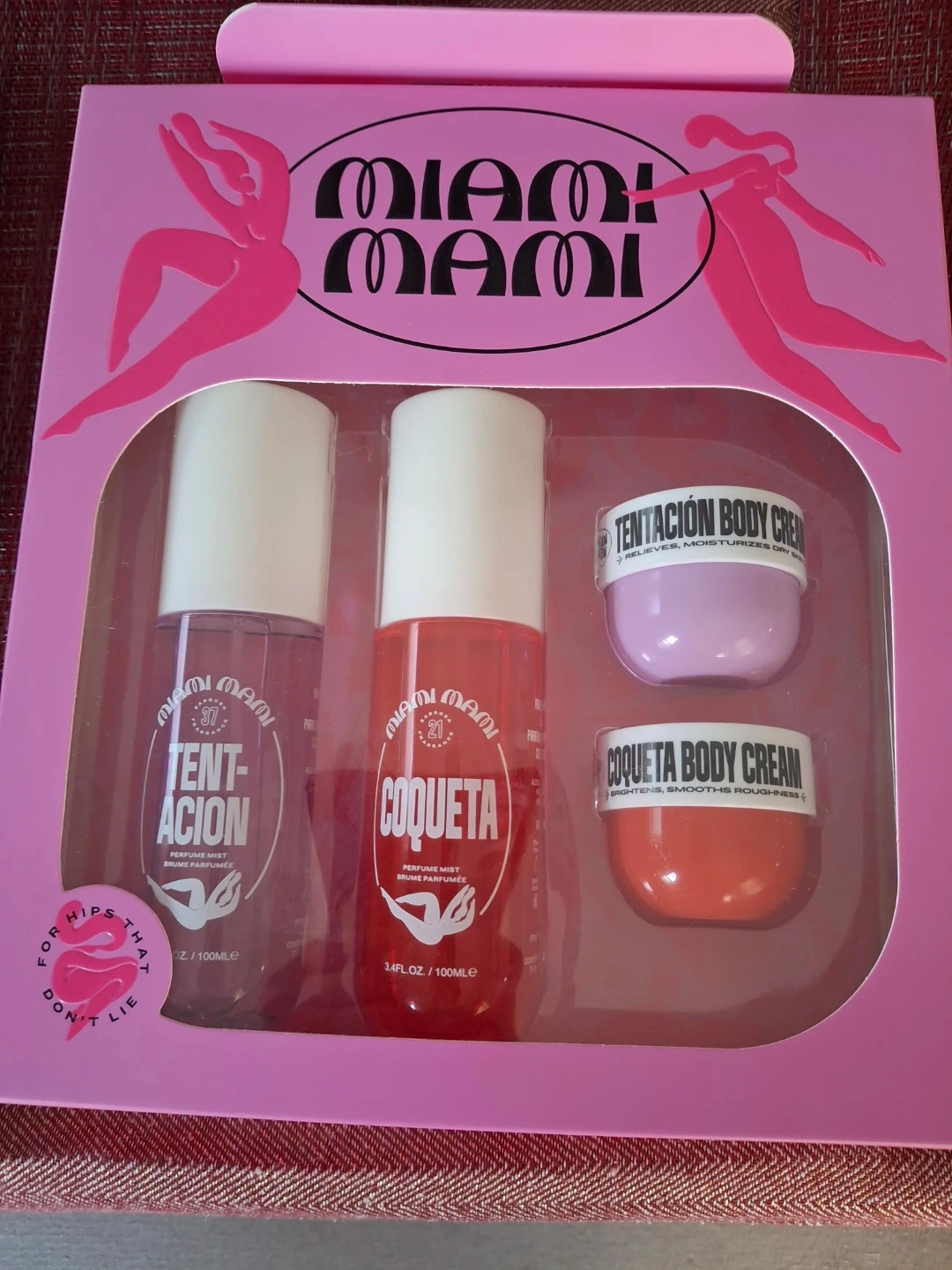Selling a Miami Mami set that includes perfume mist and body cream! The set includes Tentacion perfume mist, Coqueta perfume mist, Tentacion body cream, and Coqueta body cream. The perfume mists are each 100ml and the Coqueta perfume mist is 3.4 fl oz.