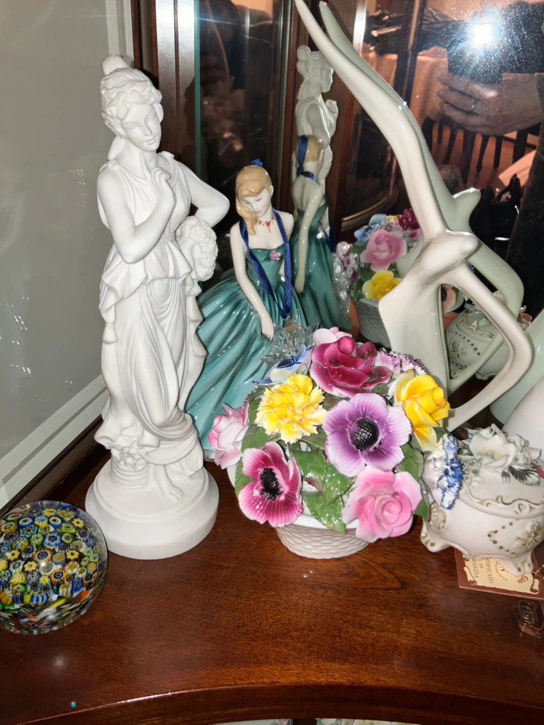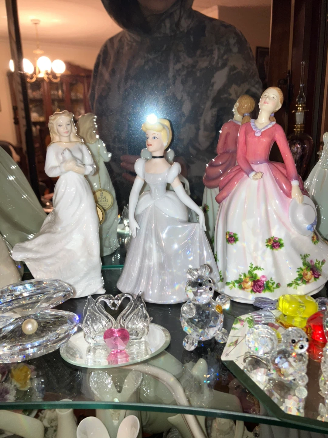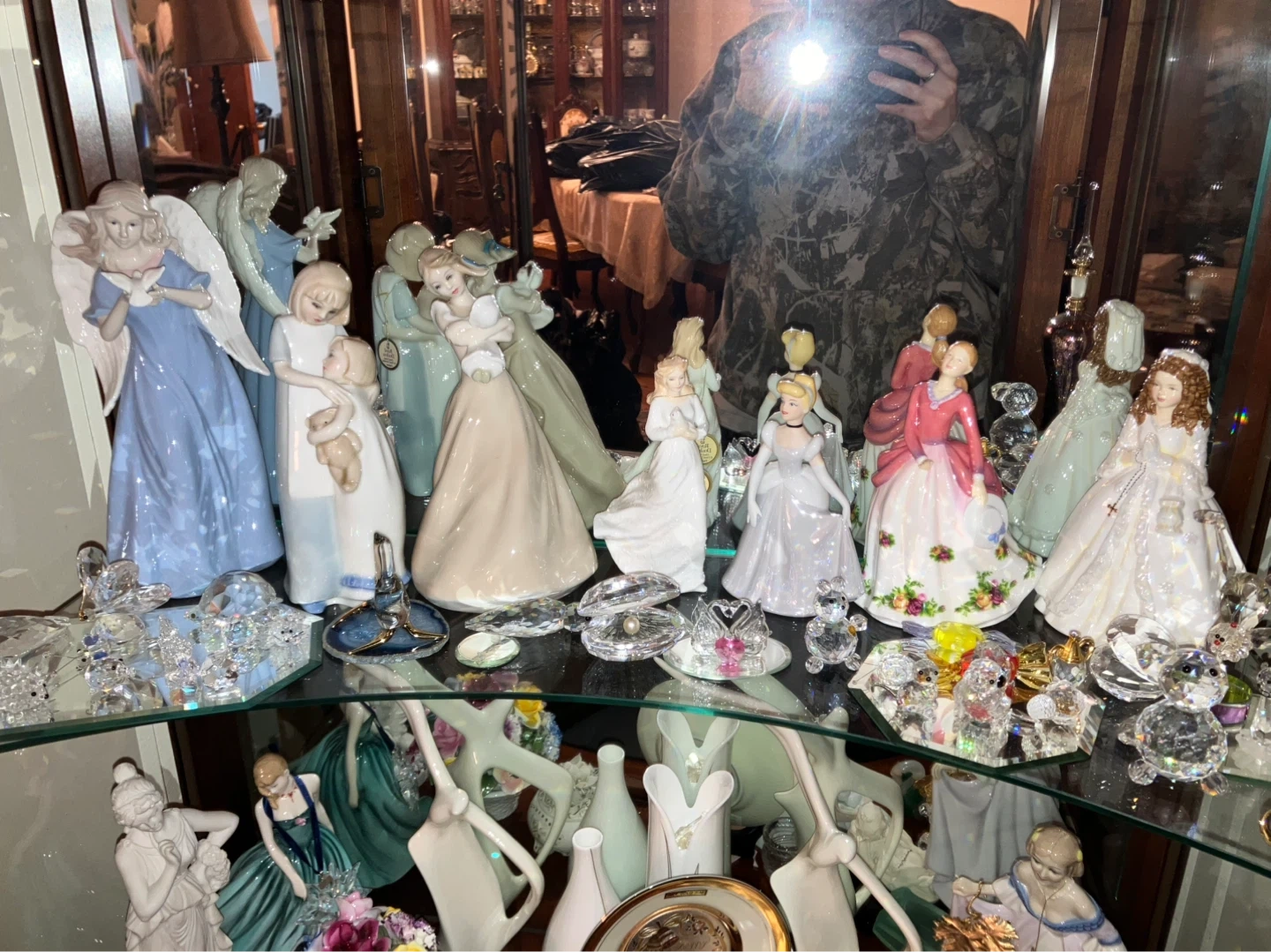 A lovely collection featuring porcelain figurines, including character figures and elegant ladies in period dress. It's complemented by sparkling crystal animals and decorative pieces. These pieces add a touch of charm to any display cabinet.