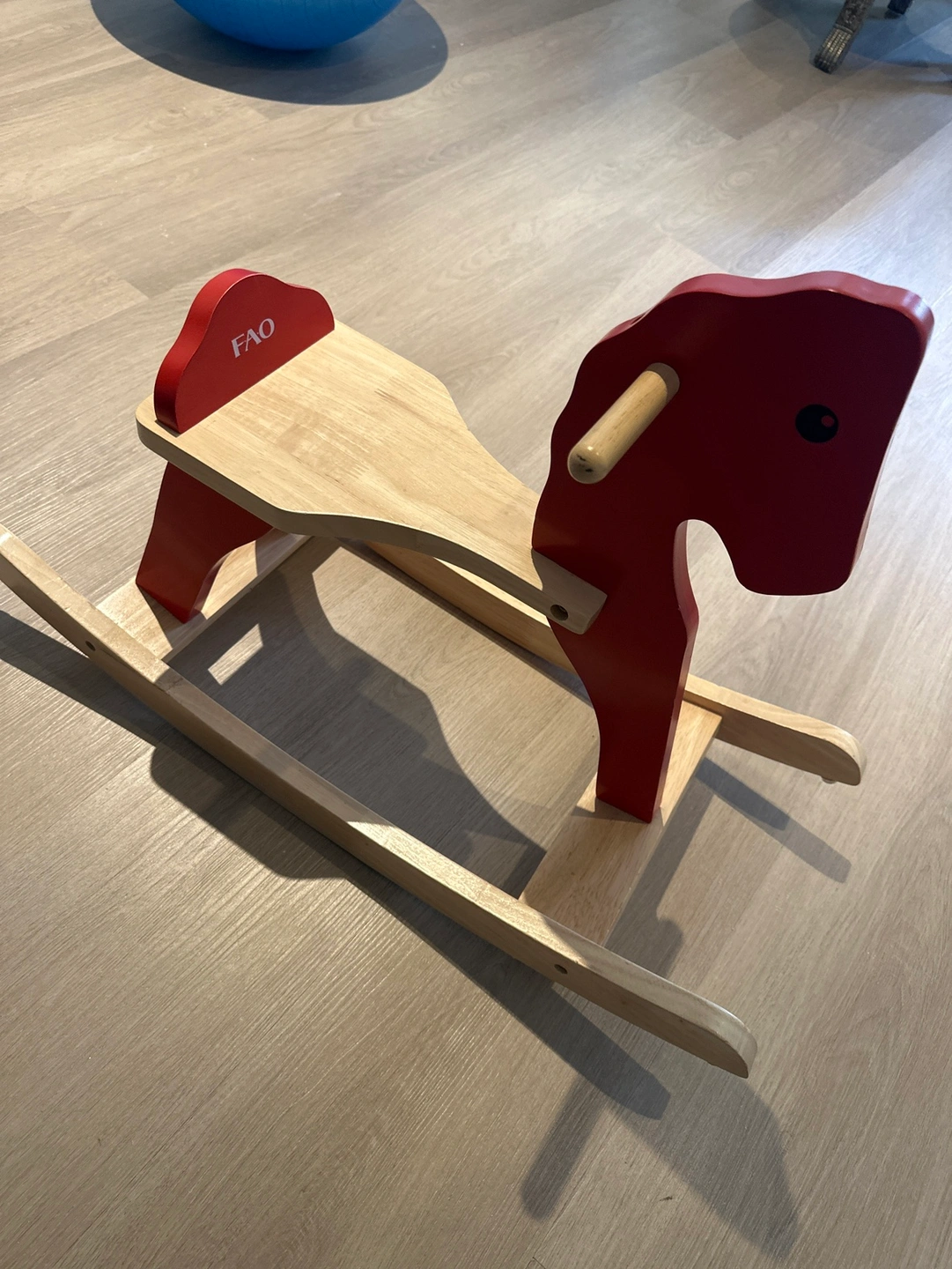 This is a charming rocking horse, perfect for little ones. It's made with a natural wood seat and red painted accents. Great for imaginative play!