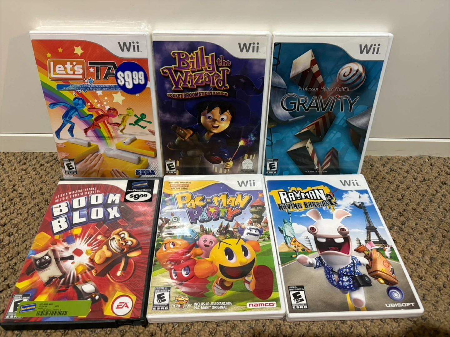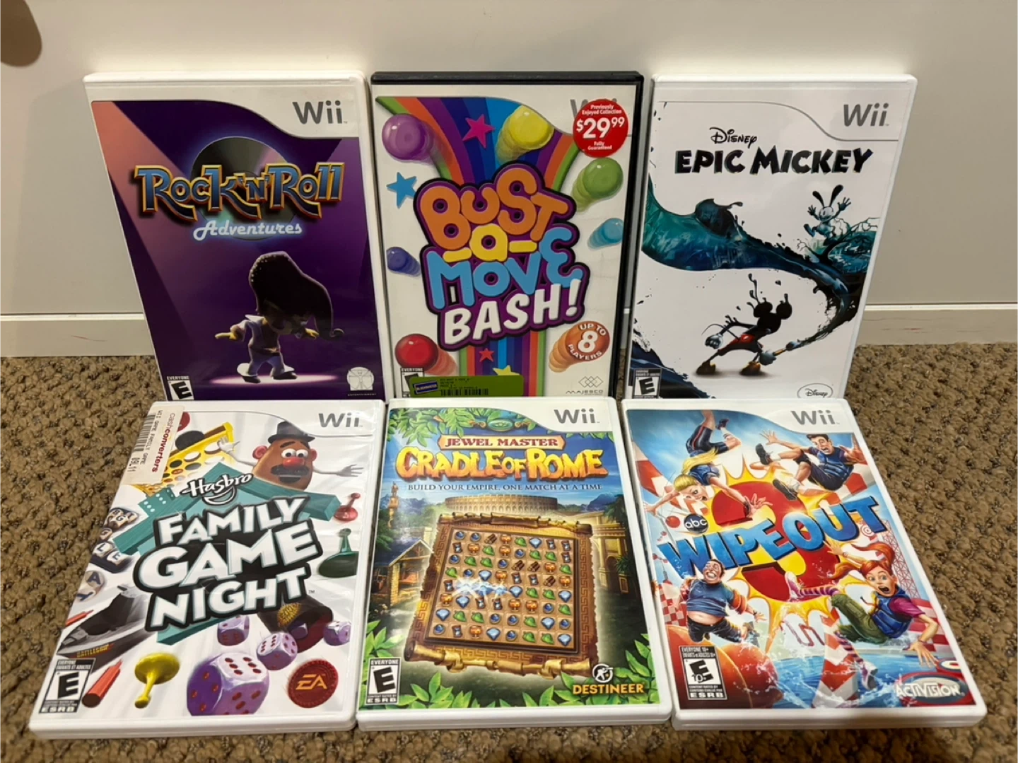 111Selling a collection of Wii games! Includes: - Rock N Roll Adventures - Bust-A-Move Bash! - Disney Epic Mickey - Hasbro Family Game Night - Jewel Master Cradle of Rome - Wipeout - Let's Tap - Billy the Wizard - Gravity - Boom Blox - Pac-Man Party - Rayman Raving Rabbids