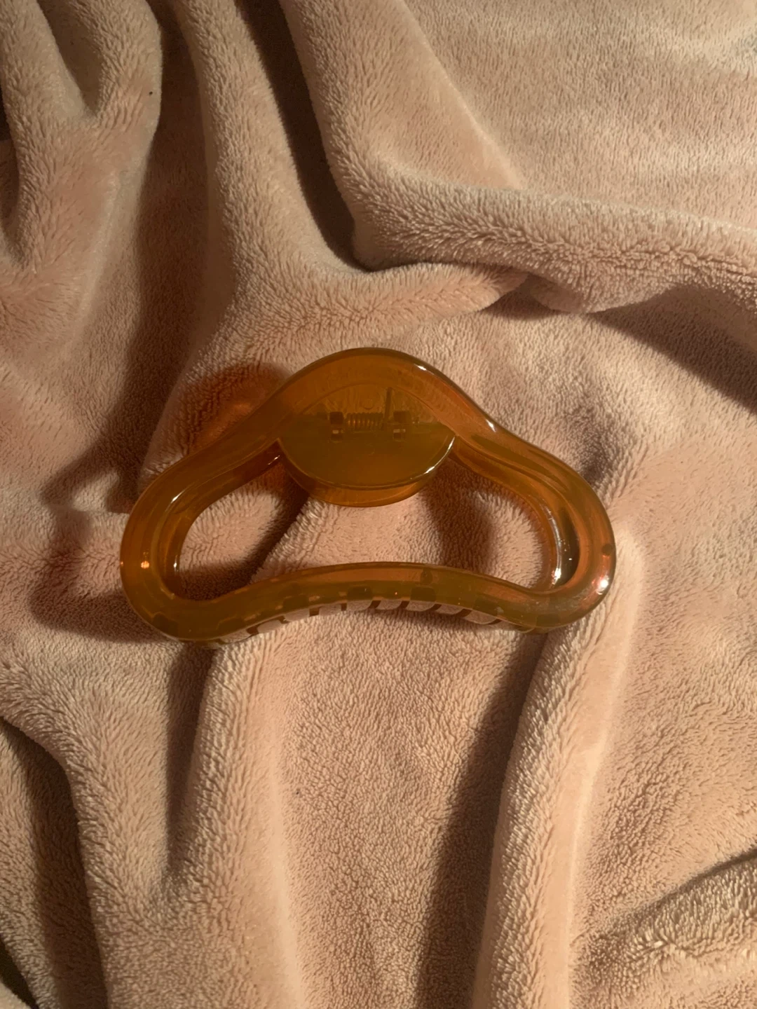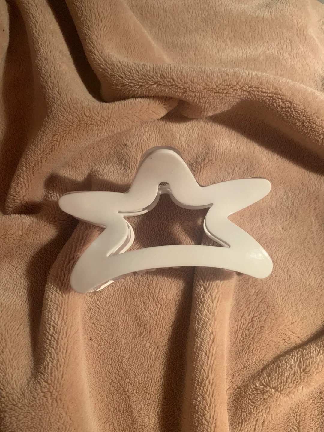 Selling three different hair claw clips. One is an amber-coloured clam-style clip. Another is a white star-shaped clip. The third is a decorative clip with pink flowers and green leaves. Great for securing hair! $5 each!