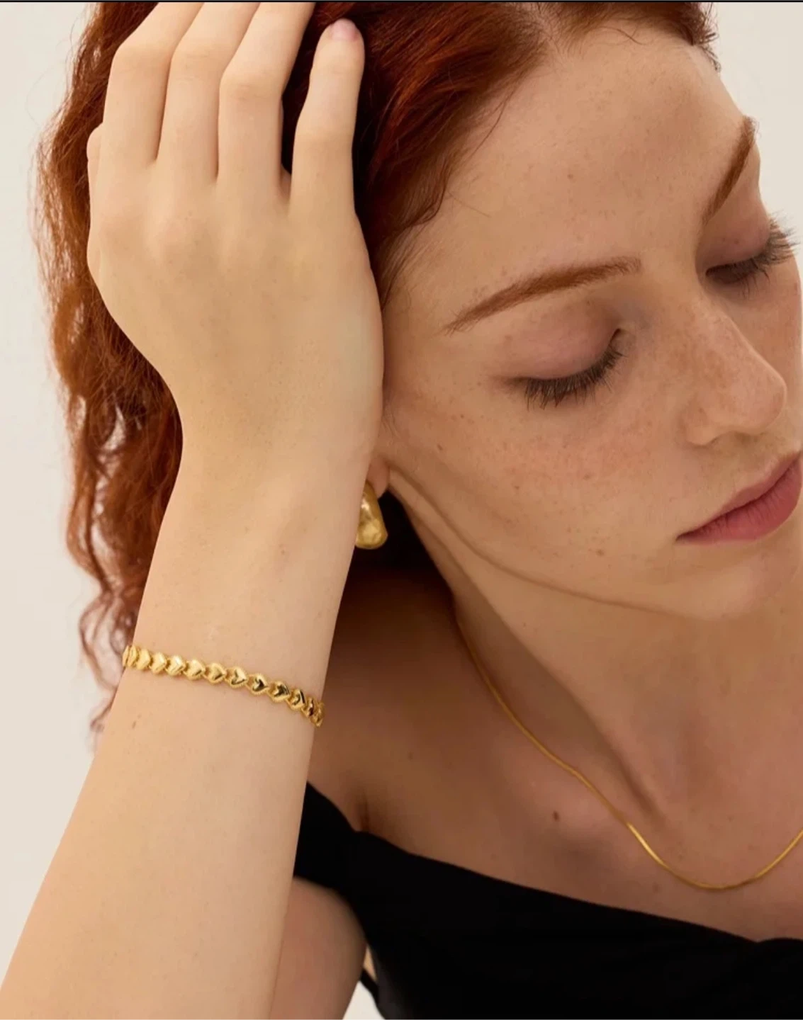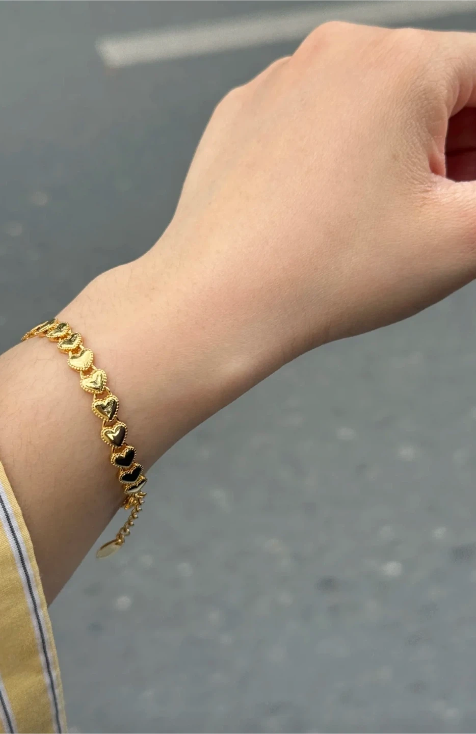 This Winding Moonlight bracelet features a delicate chain with alternating gold hearts. It has an adjustable clasp for a comfortable fit. This piece adds a lovely touch of sparkle!