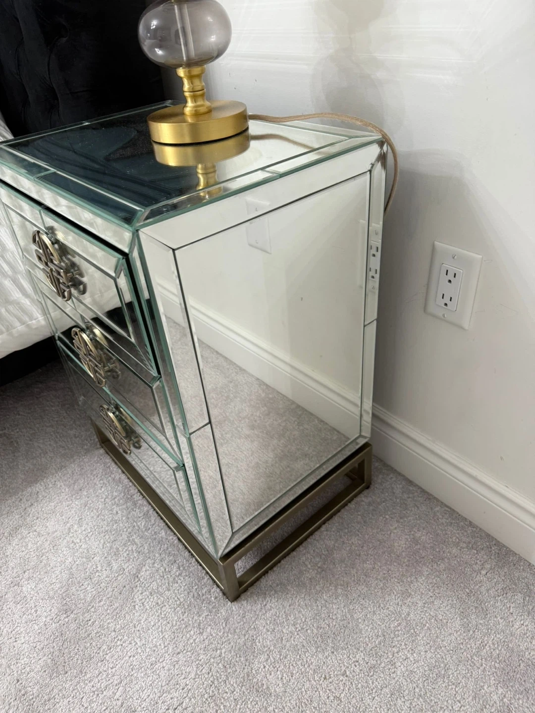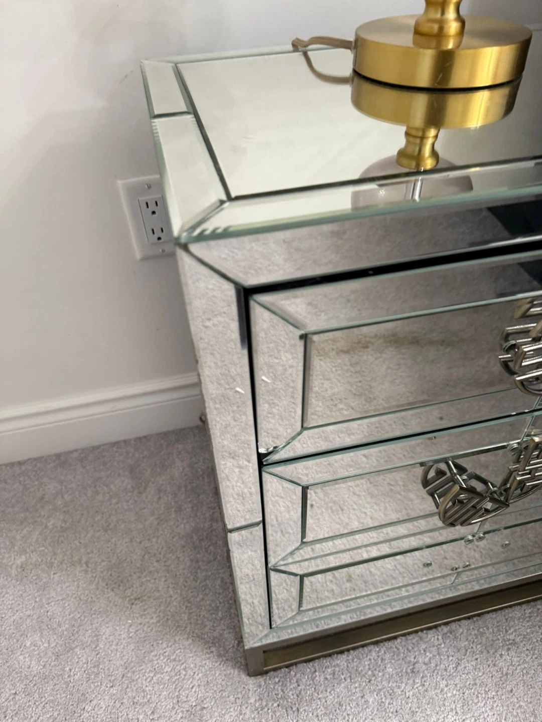 This mirrored nightstands features a sleek, modern design with three drawers. It's finished with eye-catching gold-tone circular handles and a matching metal base. The mirrored finish reflects light beautifully, making any room feel brighter and more spacious. Handles need to be placed still. Some chips but beautiful pieces. I have two.