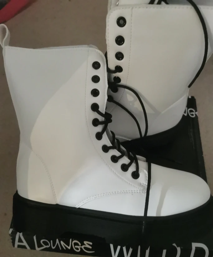15These are a pair of Wild Diva Lounge platform boots in white. They have black laces and a black platform sole. They are in good condition and come with the box