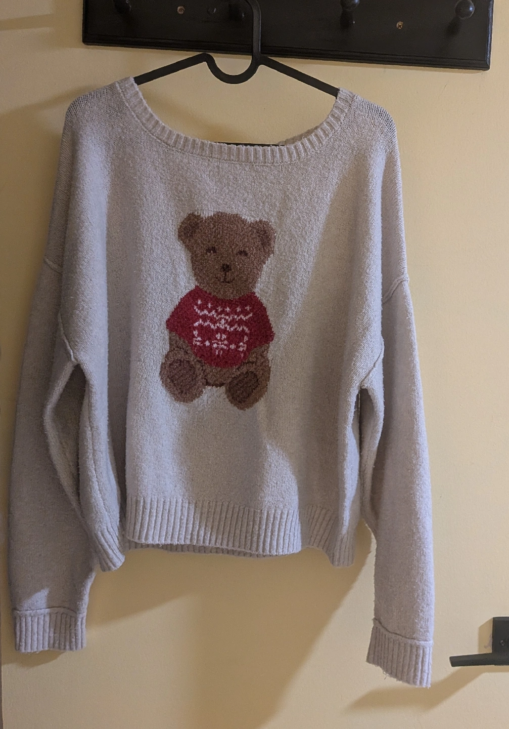118Selling a wild skye teddy bear sweater. It features a cute teddy bear in the color cream. like new barely worn.