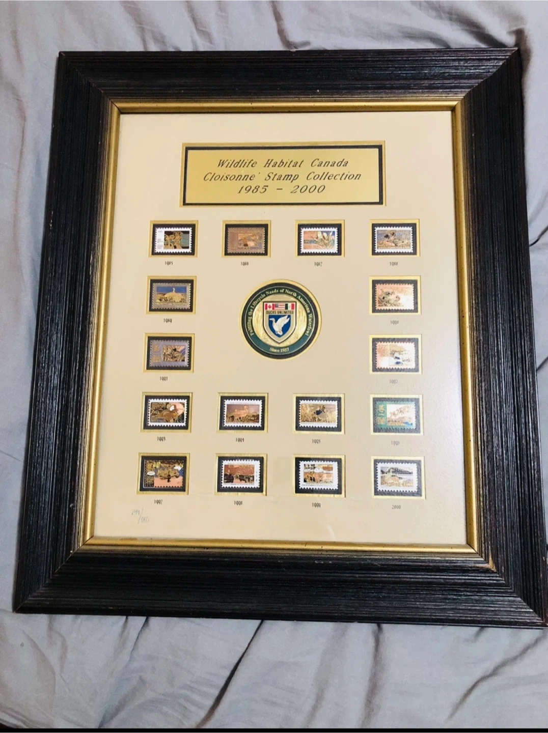 300Selling a framed Wildlife Habitat Canada Cloisonne Stamp Collection from 1985-2000. It features a series of stamps and a Ducks Unlimited emblem.
