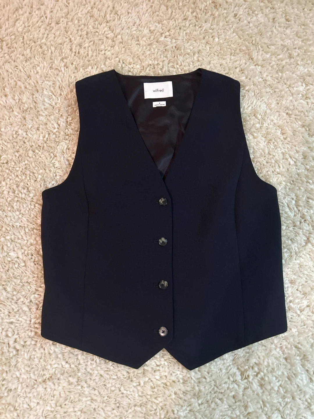 15Selling a Wilfred black vest in size 4. It's in great condition and ready for a new home! The vest has a classic design with a button-down front, perfect for layering or wearing on its own