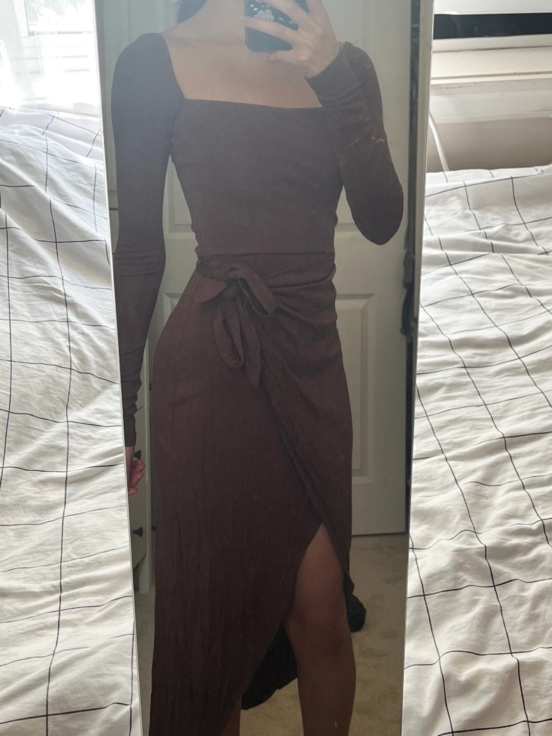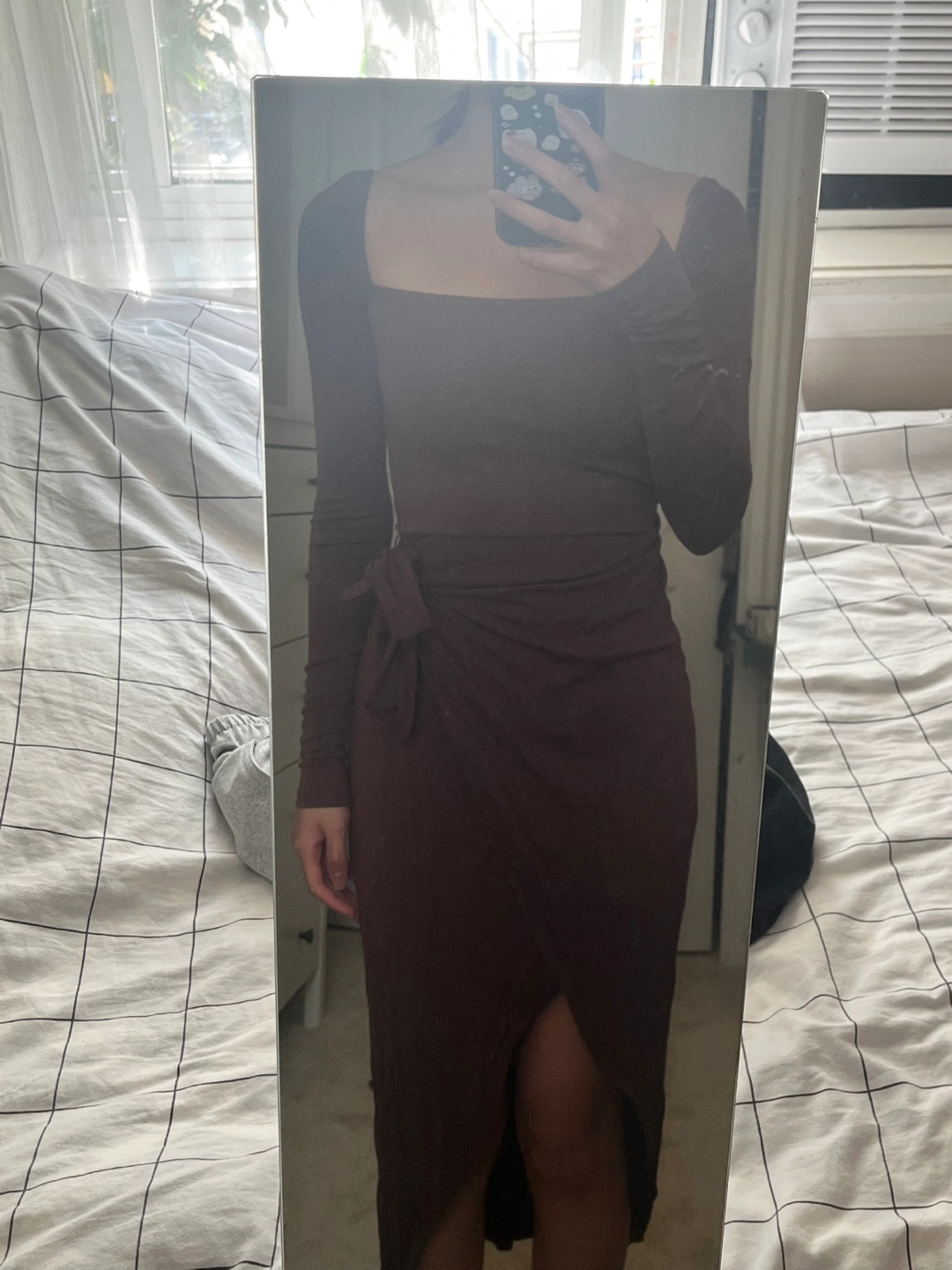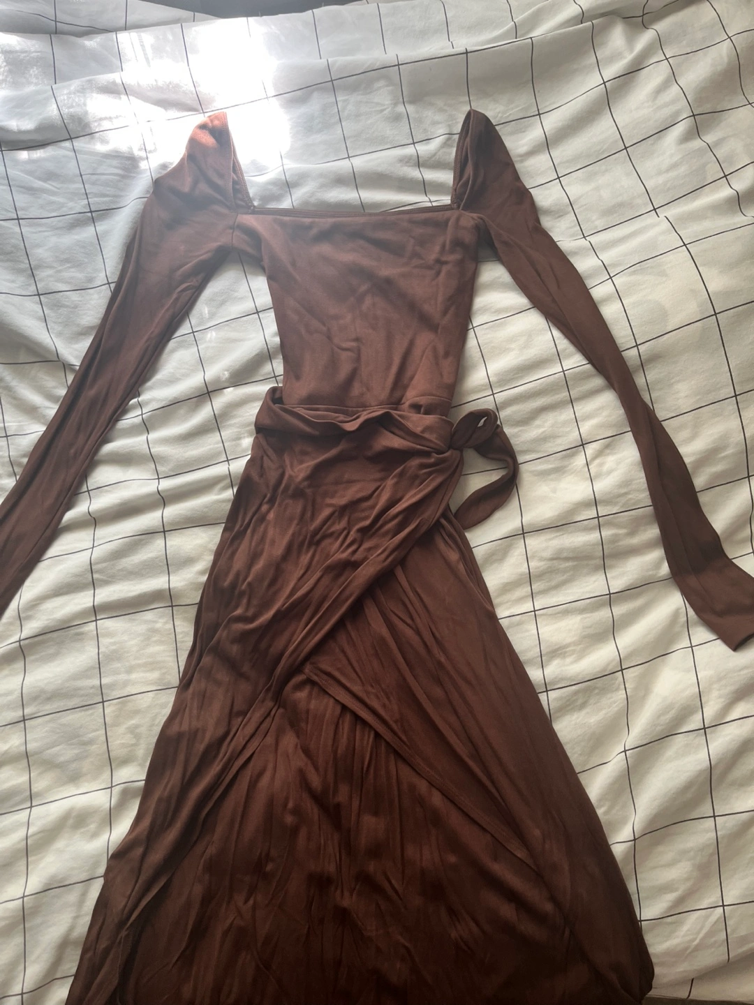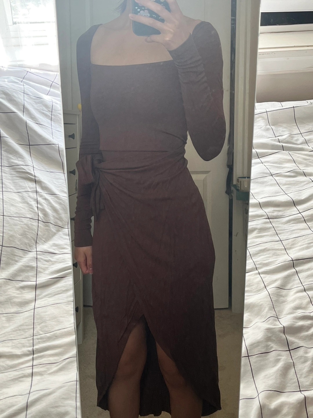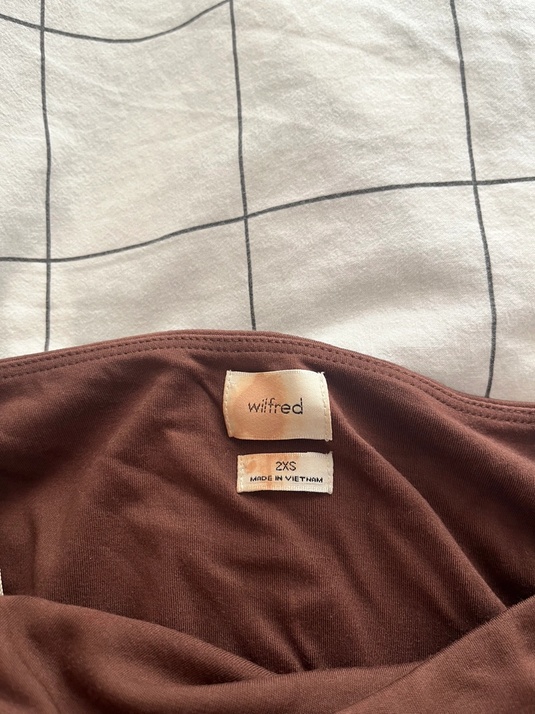 107Selling a Wilfred wrap dress in a beautiful brown colour! It's a size 2XS. Great for a night out or a special occasion Excellent condition - worn only once However make up was accidentally spilled on the tag (Last photo) Condition still feels like the same condition when it was first bought.