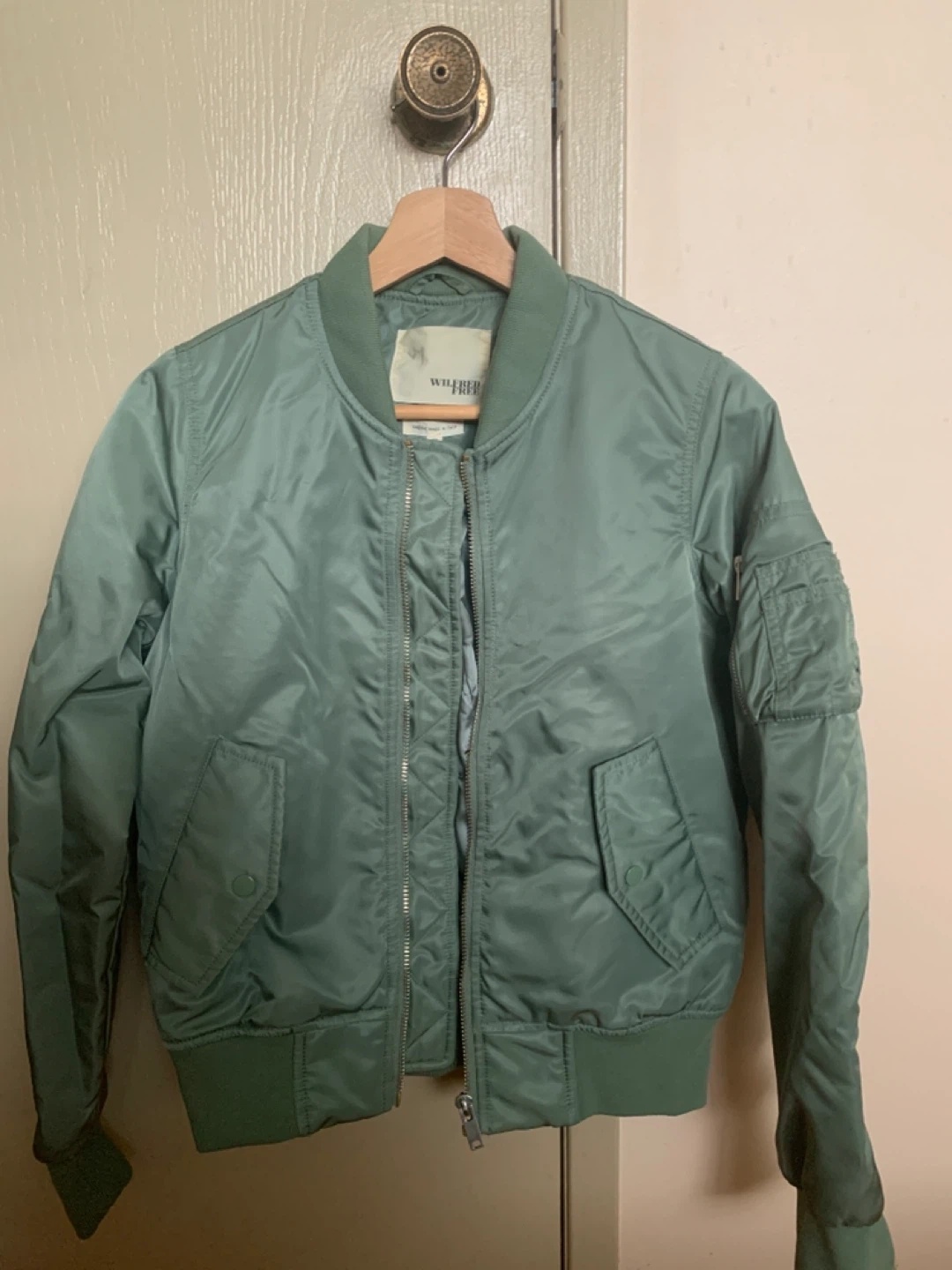 Selling a Wilfred Free bomber jacket in size XS. It's in great condition and ready for a new home! The jacket features a classic bomber style with a comfortable fit. Perfect for layering during cooler weather, it's a stylish and versatile addition to any wardrobe