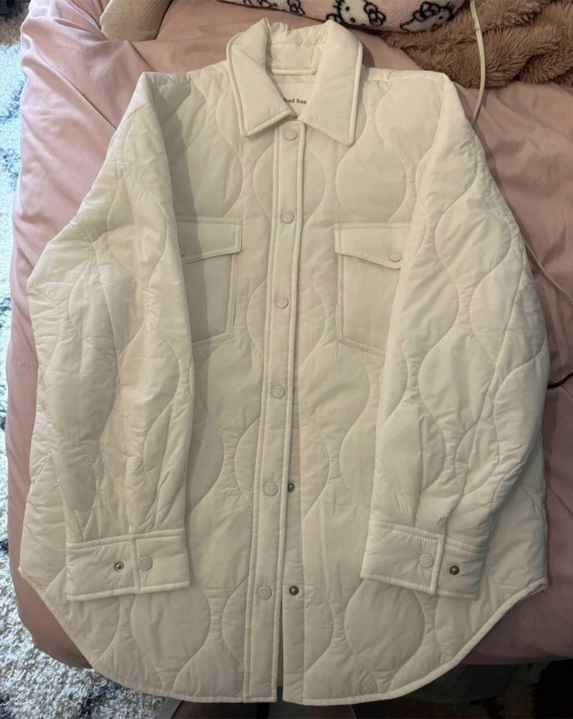 76Selling a new, never worn Wilfred Free quilted shirt jacket in a beautiful off-white colour. It's a size small but fits big and made of a comfortable material, perfect for layering! It’s in great condition and ready for a new home