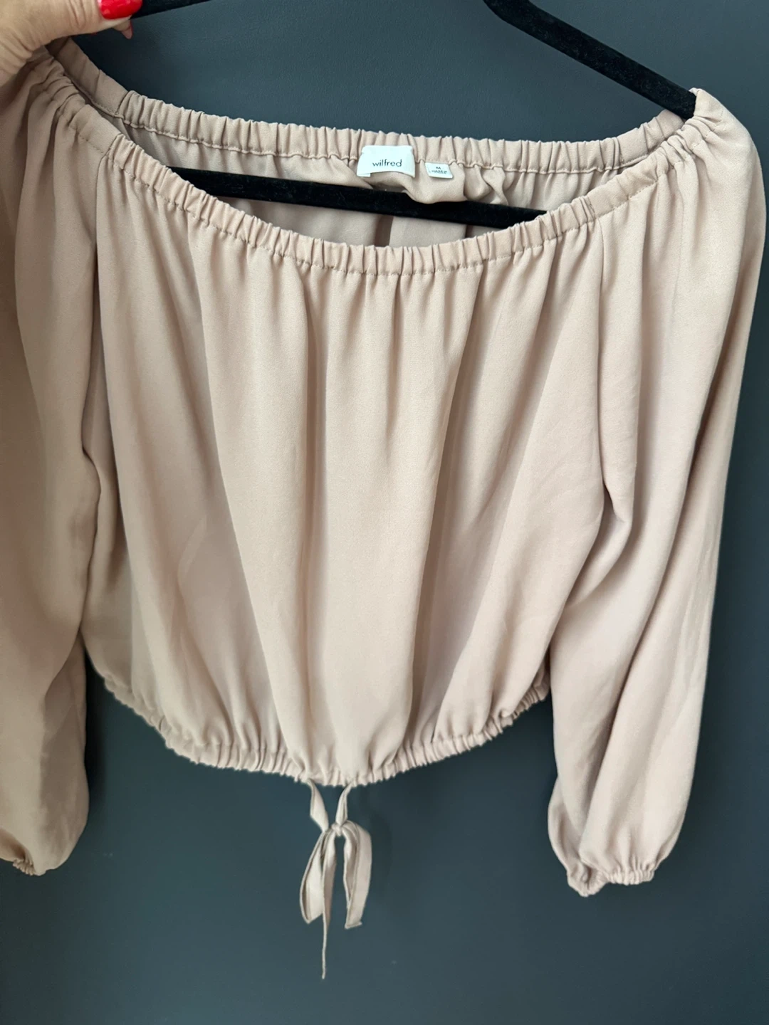 Selling a Wilfred off-the-shoulder blouse in size M! It's in great condition and has a lovely, flowy fit. Adjustable waist