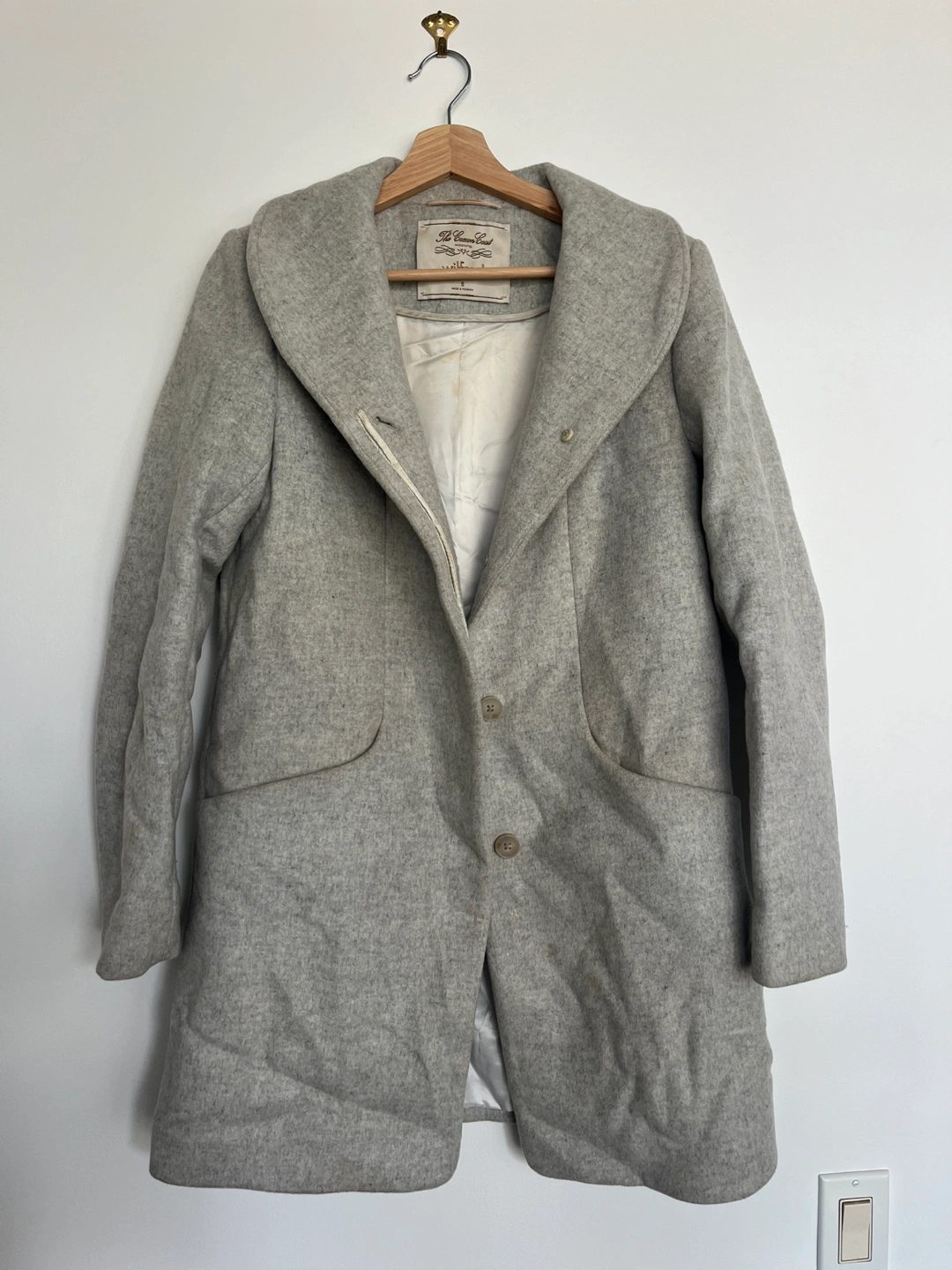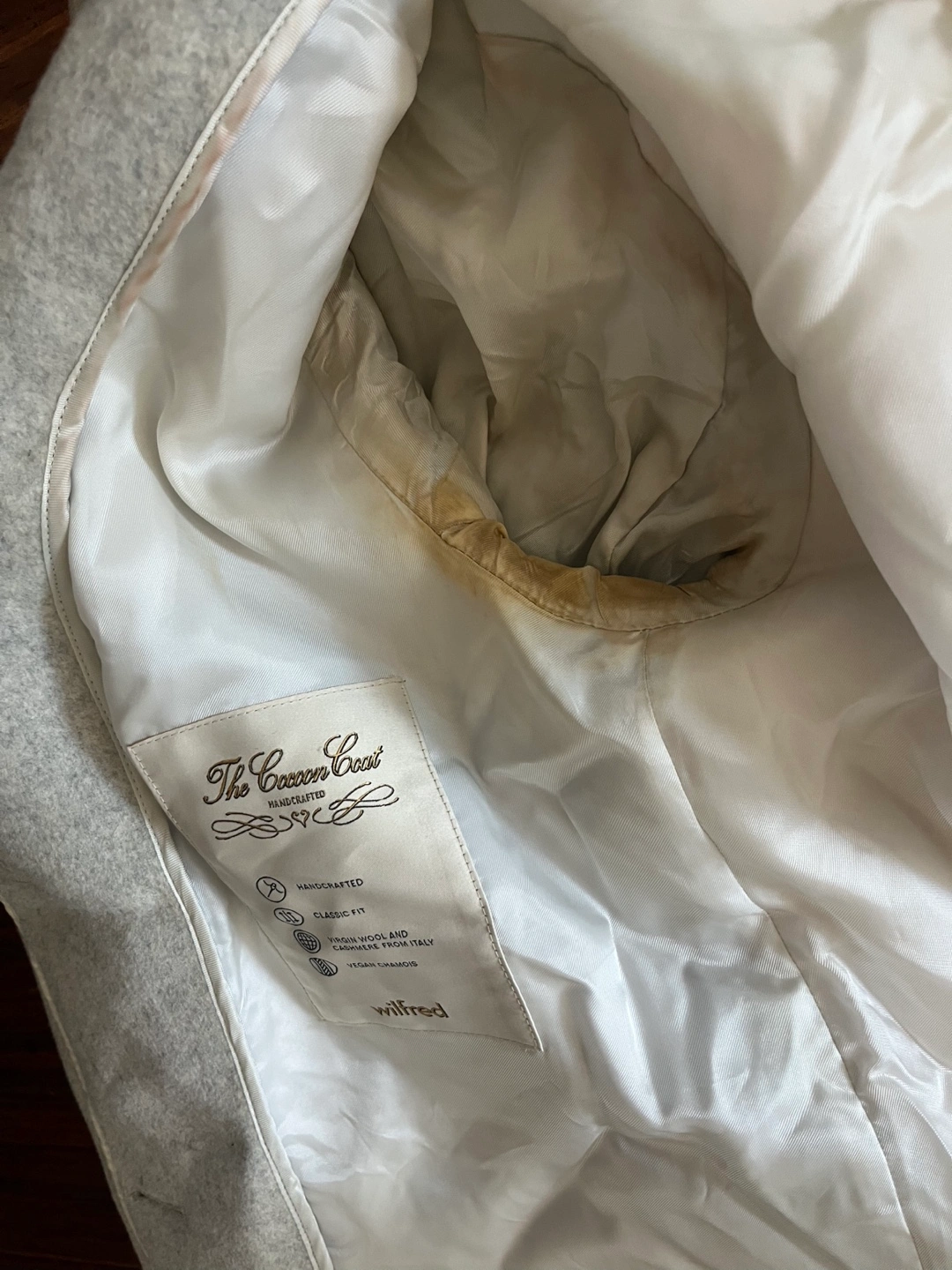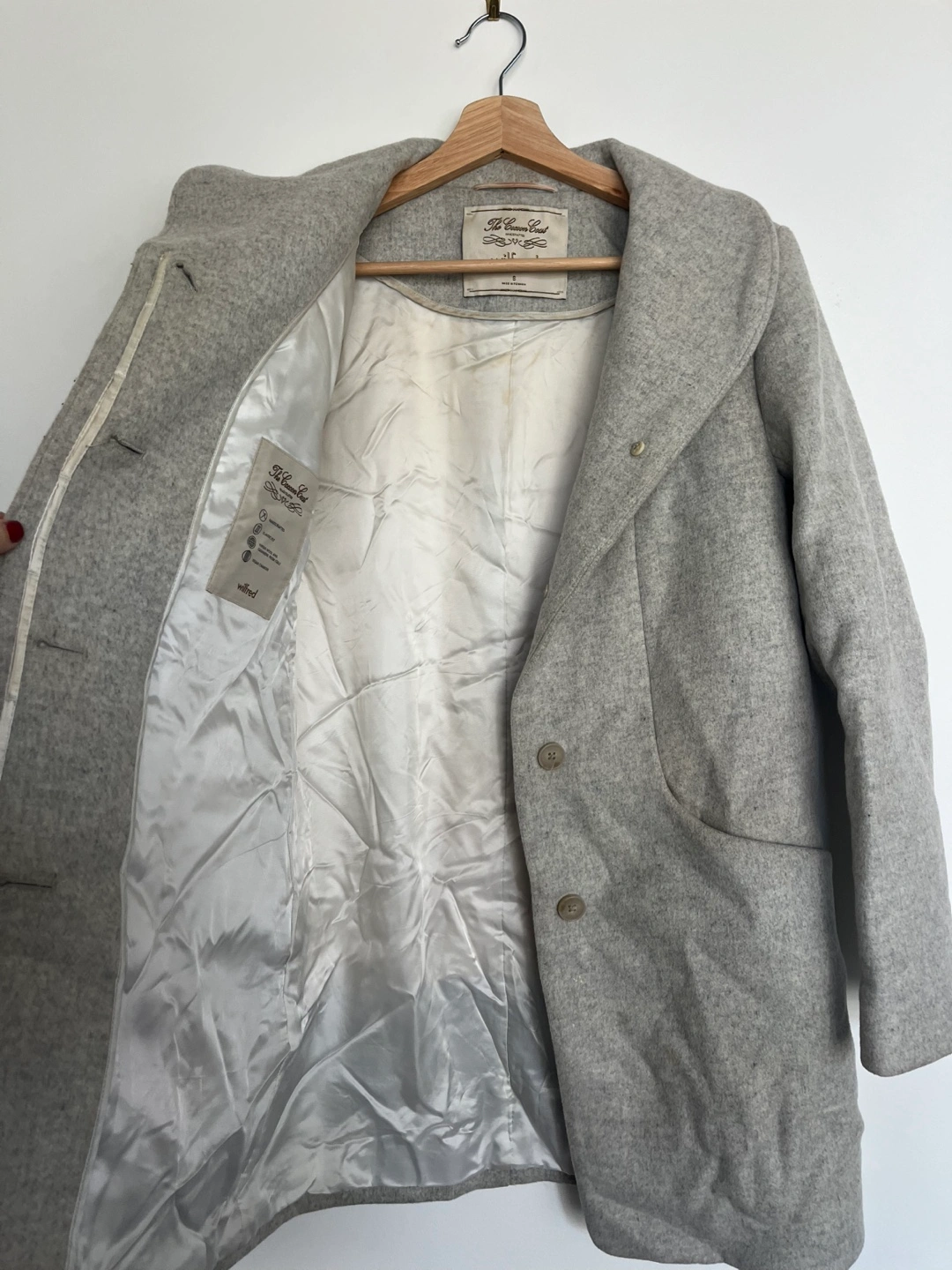 Selling a Wilfred Cocoon Coat in size small. It's a light grey colour with a classic fit. There are some stains on the inside lining of the coat.